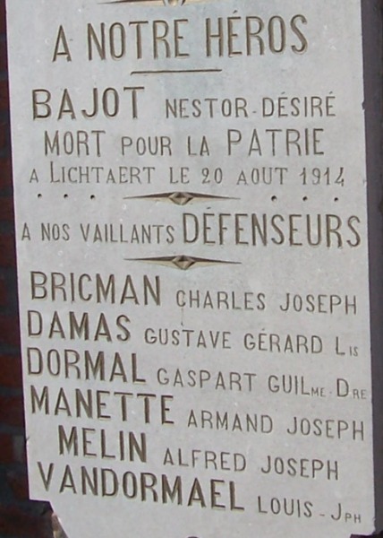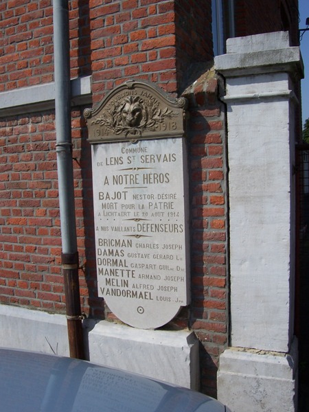 Localisation de ce monument: Rue de Lens-Saint-Rémy. Coordonnées GPS: +50° 39' 46.89", +5° 09' 17.74". Inscription figurant sur le monument "N'OUBLIONS JAMAIS 1914 - 1918 COMMUNE DE LENS-ST-SERVAIS À NOTRE HÉROS [Un nom, avec indication du lieu et de la date de décès] À NOS VAILLANTS DÉFENSEURS [Six noms, classés par ordre alphabétique]" Voir les noms mentionnés sur ce monument |