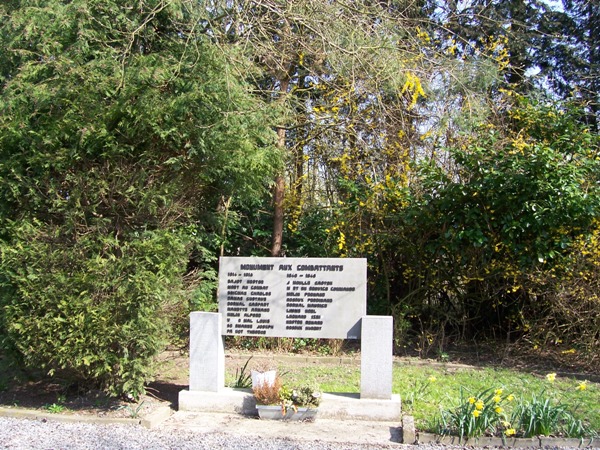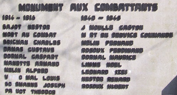 Localisation de ce monument: Au coin des rues de Geer et des Tridaines. Coordonnées GPS: 50° 39' 43.98" N, 5° 09' 23.30" E Inscription figurant sur le monument "À NOS COMBATTANTS 1914 - 1918 MORT AU COMBAT [Un nom] [Huit noms] 1940 - 1945 MORT EN SERVICE COMMANDÉ [Un nom] [Sept noms]" Voir les noms mentionnés sur ce monument |