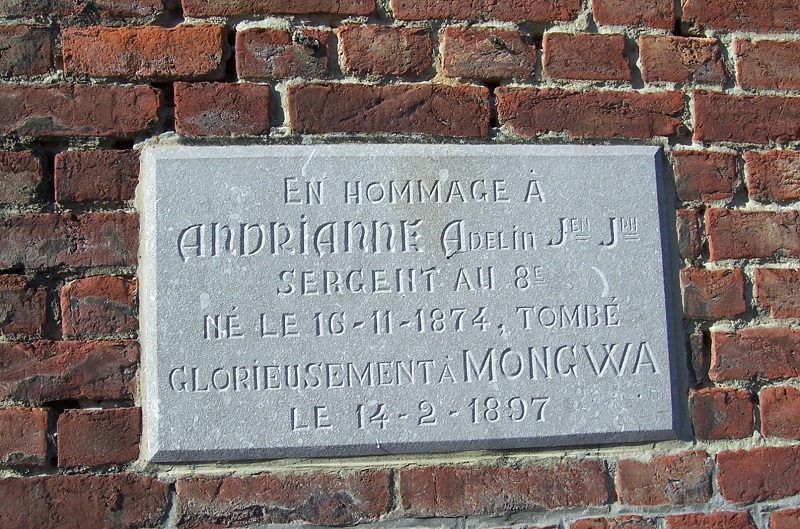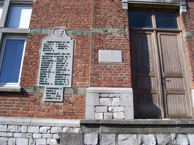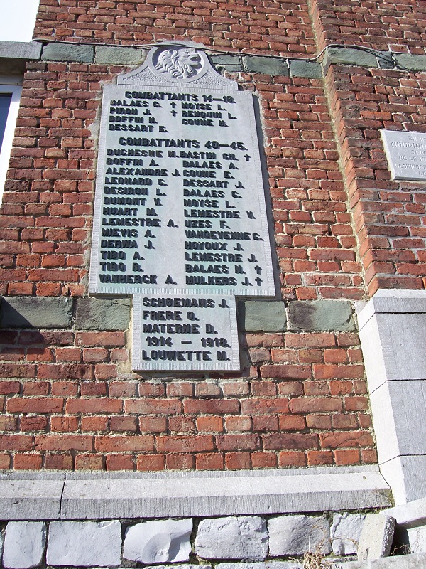Localisation: Cimetière de Lens-sur-Geer, Rue Général LENS. Coordonnées GPS: +50°43'16.4", +5°21'11.6" Inscriptions Monument funéraire "HONNEUR ET PATRIE 1914 - 1918 [Deux noms, classés par ordre alphabétique] 1940 - 1945 [Deux noms, classés par ordre alphabétique]" Plaques au sol "COMBATTANTS 14 - 18 [Sept noms, non classés par ordre alphabétique, dont deux suivis du symbole † ] COMBATTANTS 40 - 45 [Vingt-neuf noms, non classés par ordre alphabétique, dont trois suivis du symbole † ] 1914 - 1918 [Un nom]" "EN HOMMAGE À ANDRIANNE ADELIN Jen JPH SERGENT AU 8e NÉ LE 16-11-1874 TOMBÉ GLORIEUSEMENT À MONGWA LE 14-2-1897" Informations complémentaires À l'origine, les plaques au sol étaient apposées sur la façade de l'ancienne maison communale, située Rue Ramkin, laquelle a été démolie en juin 2008. Voir les noms mentionnés sur ces monuments |