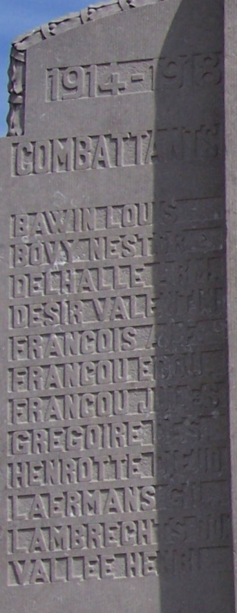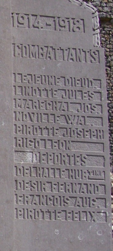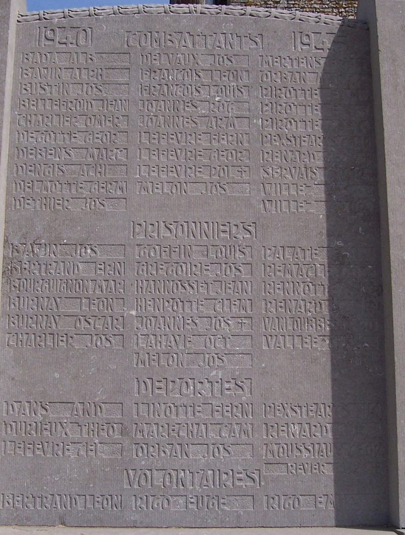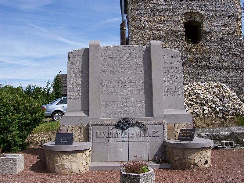 Localisation de ce monument: Rue de l'Église. Coordonnées GPS: 50° 39' 37"N, 5° 18' 36"E. Inscription figurant sur le monument Panneau de gauche "1914 - 1918 COMBATTANTS [Douze noms]" Panneau central "1940 - 1945 COMBATTANTS [Vingt-neuf noms] PRISONNIERS [Dix-neuf noms] VOLONTAIRES [Trois noms]" Panneau de droite "1914 - 1918 COMBATTANTS [Six noms] DÉPORTÉS [Quatre noms]" Socle "LIMONT À SES BRAVES" Voir les noms mentionnés sur ce monument |