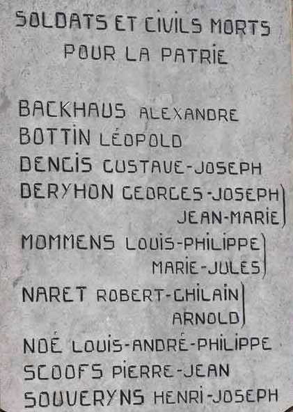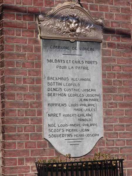 Localisation de ce monument: Sur la façade de l'ancienne maison communale, rue de Jemeppe, 22. Coordonnées GPS: +50° 39' 56.00", +5° 30' 14.56". Inscription figurant sur le monument "N'OUBLIONS JAMAIS 1914 - 1918 COMMUNE DE LONCIN SOLDATS ET CIVILS MORTS POUR LA PATRIE [Neuf noms, classés par ordre alphabétique]" Voir les noms gravés sur ce monument |