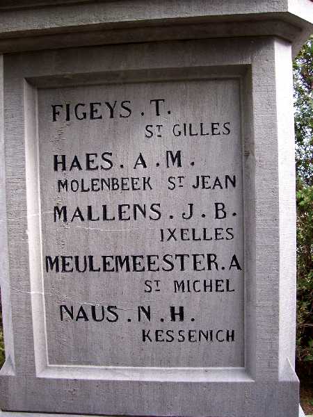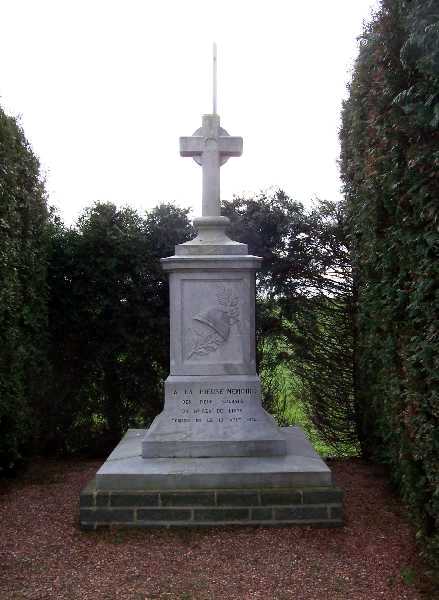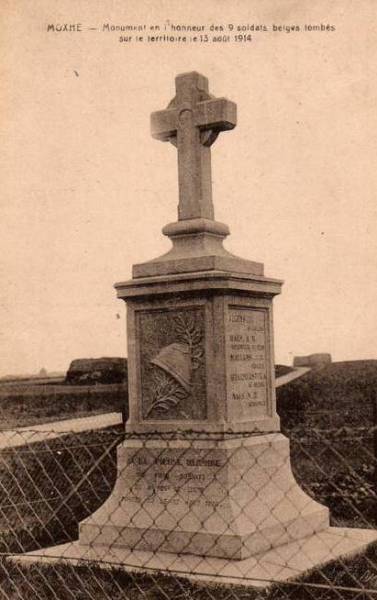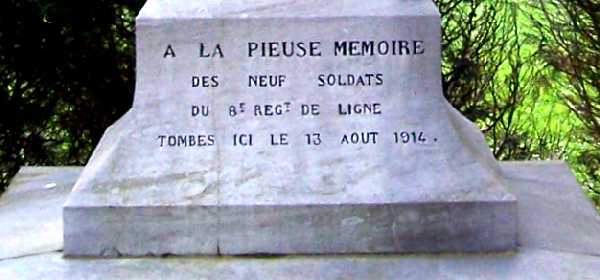 Localisation de ce monument: Chaussée romaine. Coordonnées GPS: 50°38'15.61"N, 5°04'45.50"E Inscription figurant sur le monument "À LA PIEUSE MÉMOIRE DES NEUF SOLDATS DU 8e REGt DE LIGNE TOMBÉS ICI LE 13 AOÛT 1914 [Neuf noms sur les faces latérales du monument]" Voir les noms mentionnés sur ce monument |