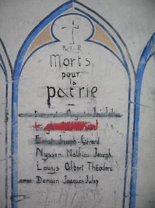Localisation de ce dessin: Fort d'Aubin-Neufchâteau, au bout de la rue du Colonel D'ARDENNE. Coordonnées GPS: +50°43'18.00", +5°47'24.00". Inscription figurant sur le dessin "R.I.P. MORTS / POUR / LA / PATRIE [Un certain nombre de noms, dont certains rayés et d'autres difficilement lisibles]" Pour la liste des victimes présentées sur le lien ci-dessous, référence a été faite au monument commémoratif à l'entrée du fort et au site World War Tours Voir les noms mentionnés sur ce dessin |