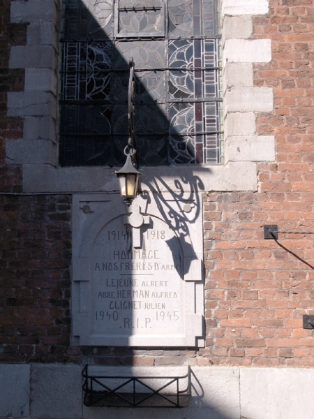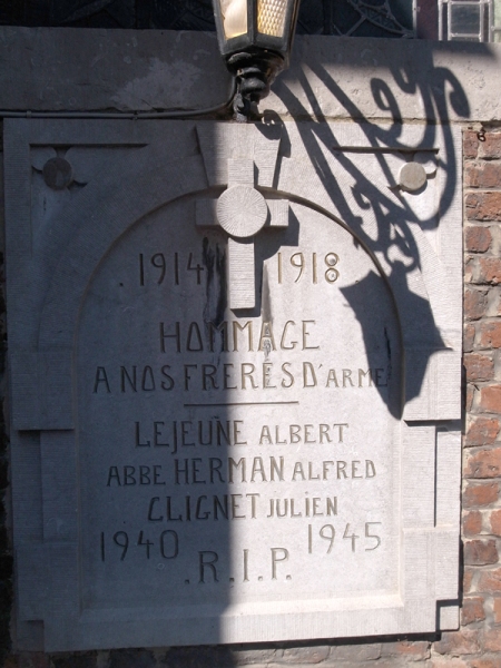 Localisation de cette stèle: Sur un des murs extérieurs de l'église, Aubin. Coordonnées GPS: +50°43'11.99", +5°46'34.74". Inscription figurant sur la stèle "1914 - 1918 HOMMAGE À NOS FRÈRES D'ARMES [Trois noms, non classés par ordre alphabétique] 1940 - 1945 R.I.P." Voir les noms mentionnés sur la stèle |