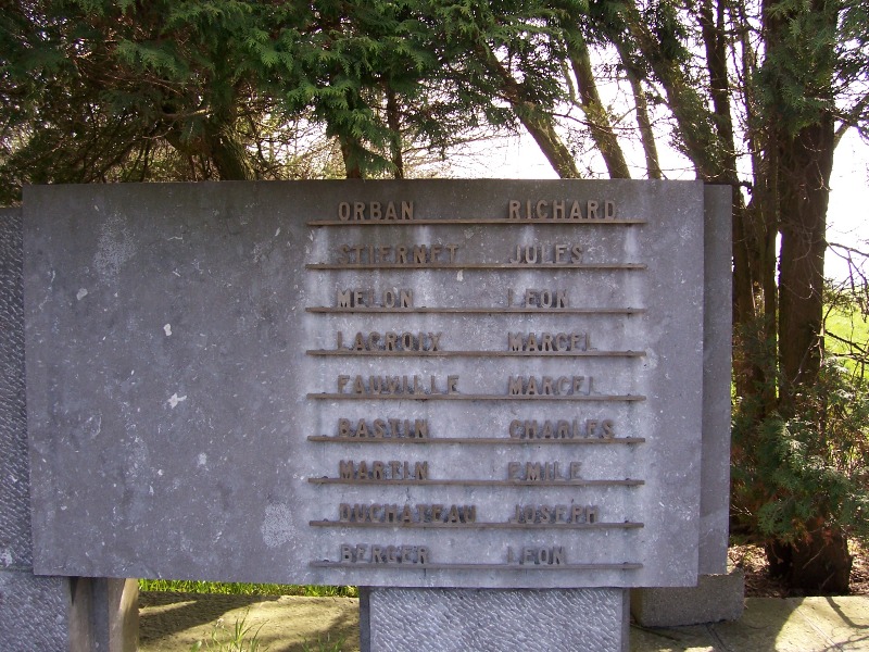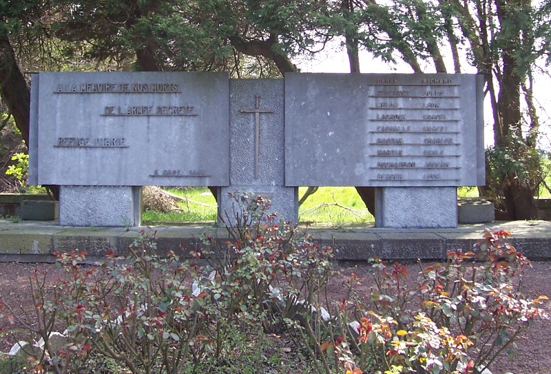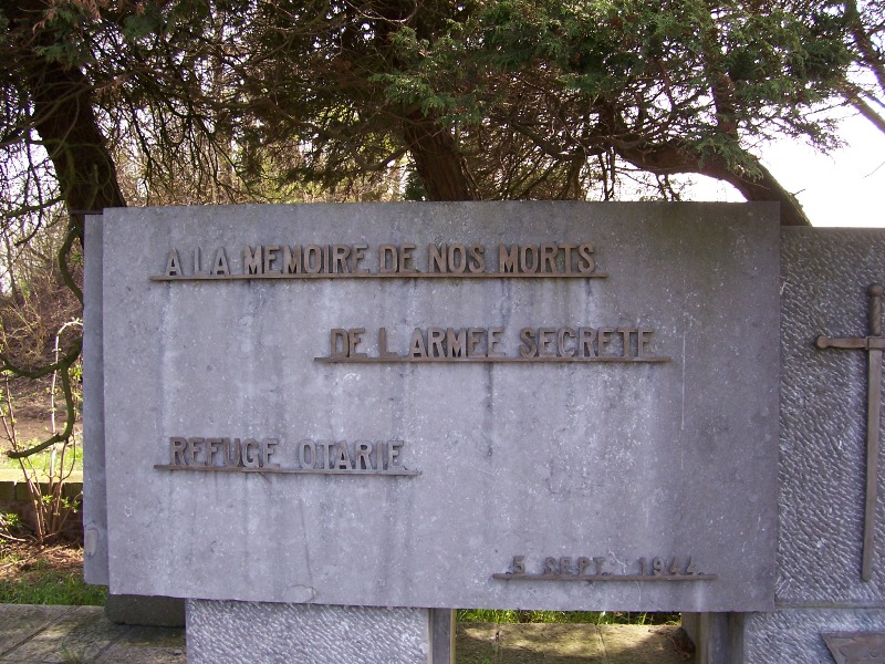 Localisation de ce monument: Chaussée romaine, à l'entrée de Omal en venant de Waremme. Coordonnées GPS: 50°39'03" 5°12'02". Inscription figurant sur le monument "À LA MÉMOIRE DE NOS MORTS DE L'ARMÉE SECRÈTE REFUGE OTARIE |