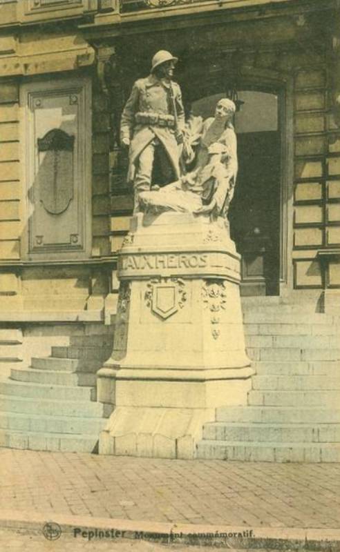 Localisation de ce monument: Devant et sur la façade de l'Hôtel de Ville, à l'angle de la Rue Neuve et de la Rue Pépin. Coordonnées GPS: +50°34'00.84", +5°48'12.90". Inscription figurant sur le monument Monument à l'avant-plan "AUX HÉROS AUX MARTYRS 1914 - 1918 1940 - 1945 L'UNION FAIT LA FORCE" Plaque de gauche sur la façade de la maison communale "N'OUBLIONS JAMAIS 1914 1918 COMMUNE DE PEPINSTER SONT MORTS POUR LA PATRIE MILITAIRES [Dix noms, classés par ordre alphabétique] 1940 1945 MILITAIRES [Six noms, classés par ordre alphabétique] TUÉS PAR BOMBARDEMENTS [Six noms, classés par ordre alphabétique] VICTIME CIVILE [Un nom]" Plaque de droite sur la façade de la maison communale "N'OUBLIONS JAMAIS 1914 1918 COMMUNE DE PEPINSTER SONT MORTS POUR LA PATRIE MILITAIRES [Cinq noms, classés par ordre alphabétique, sauf un] CIVILS [Trois noms, classés par ordre alphabétique, avec la cause du décès] 1940 1945 FUSILLÉS [Six noms, classés par ordre alphabétique] RÉSISTANT FUSILLÉ [Un nom] MORTS (CAMPS DE CONCENTRATION) [Deux noms, classés par ordre alphabétique] MORTS (SUITE FAITS DE GUERRE) [Deux noms, classés par ordre alphabétique] FUSILLÉ [Un nom]" Sculpteur du monument: Fernand Gysen ( - Voir les noms gravés sur les plaques |