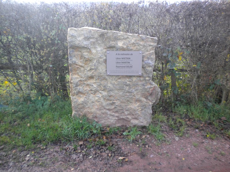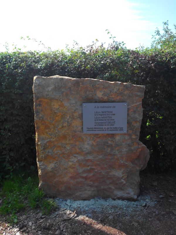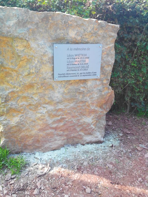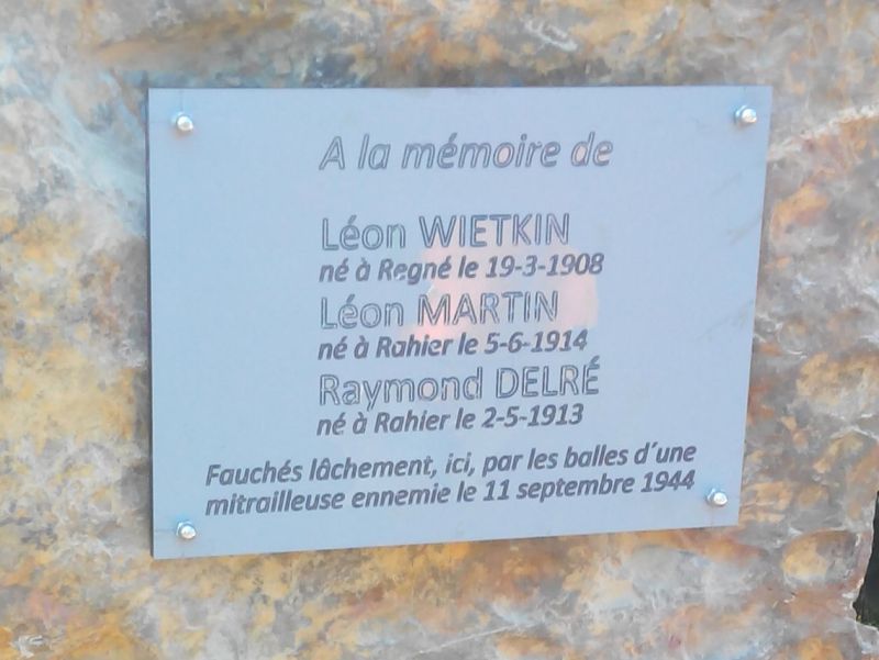 Localisation de cette stèle: Chemin de Chession, à route, entre les habitations n°53 et 55. Coordonnées GPS: +50°23'47.28", +5°45'54.33" Inscription figurant sur la stèle "À LA MÉMOIRE DE [Trois noms, avec lieu et date de naissance, non classés par ordre alphabétique] FAUCHÉS LÂCHEMENT, ICI, PAR LES BALLES D'UNE MITRAILLEUSE ENNEMIE LE 11 SEPTEMBRE 1944" Plus d'informations concernant ces personnes |