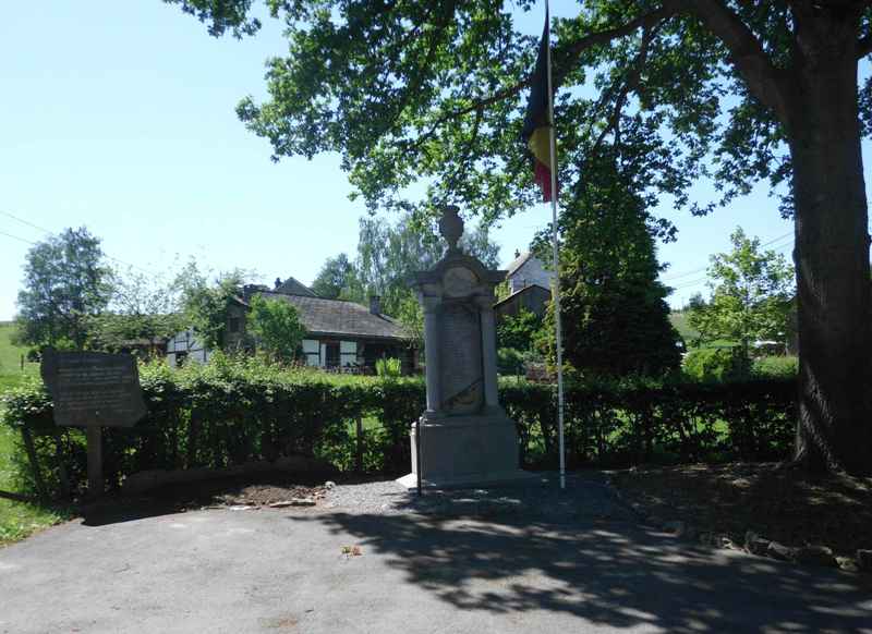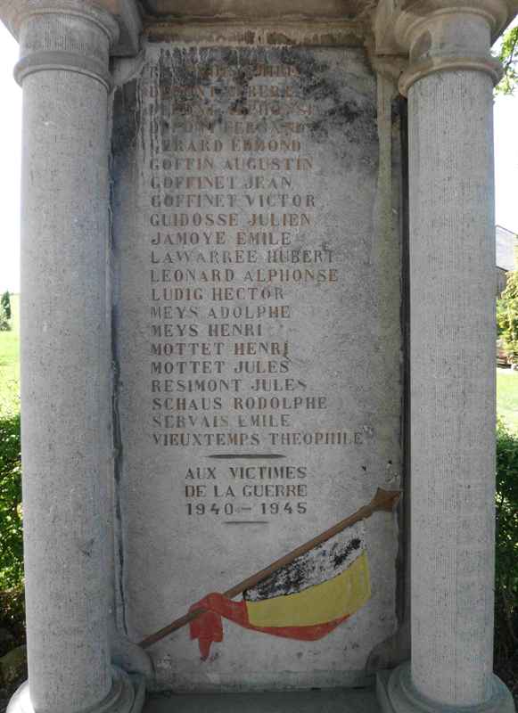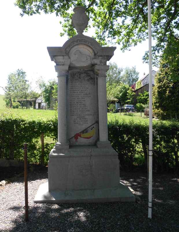 Localisation de ce monument: Au carrefour formé par 4 rues sans nom dont celle menant à l'église et à proximité de l'école communale. Coordonnées GPS: +50°23'04.58", +5°46'42.91". Inscription figurant sur le monument "LA COMMUNE DE RAHIER À SES HÉROS 1914 - 1918 [Vingt et un noms, classés par ordre alphabétique] AUX VICTIMES DE LA GUERRE 1940 - 1945" Le monument a été réalisé par G. BERTRAND de FLORZÉ (SPRIMONT), LG, BE. Informations complémentaires Ce monument aux héros des deux guerres a été édifié en l'honneur des héros de la première guerre mondiale. C'est à l'occasion de son inauguration, en 1919, que le chêne voisin fut planté. Cet édifice est appelé "Monument aux Héros" et non "aux Morts" car, lors de son inauguration, les anciens combattants dont les noms étaient gravés sur la stèle vivaient encore. Ces héros, bien que revenus indemnes de la Grande Guerre, méritaient eux aussi de participer à la mémoire collective. La mention des victimes de la guerre 1940-1945 a été faite après cette dernière. Informations tirées du dépliant "Balade des schistes en poésie" publié par "Les Amis de l'Ancien Château de Rahier" et fournies par Philippe HAMOIR. Inscription figurant sur la plaque en ardoise à côté du monument "LES DEUX MOISSONS... MOISSON D'ÉPIS OU MOISSON D'HOMMES ŒUVRE DE VIE, ŒUVRE DE MORT, IL FAUT CHOISIR: FOUS QUE NOUS SOMMES. C'EST EN NOS MAINS QU'EST NOTRE SORT. DANS LA PAIX, QUI SEULE EST FÉCONDE, MÊLONS LES BRAS, MÊLONS LES CŒURS ET GUÉRISSONS ENFIN LE MONDE DE LA GUERRE ET DE SES FUREURS." Poème de Frédéric Passy (en savoir plus: Frédéric Passy - Wikipédia) Voir les noms gravés sur ce monument |