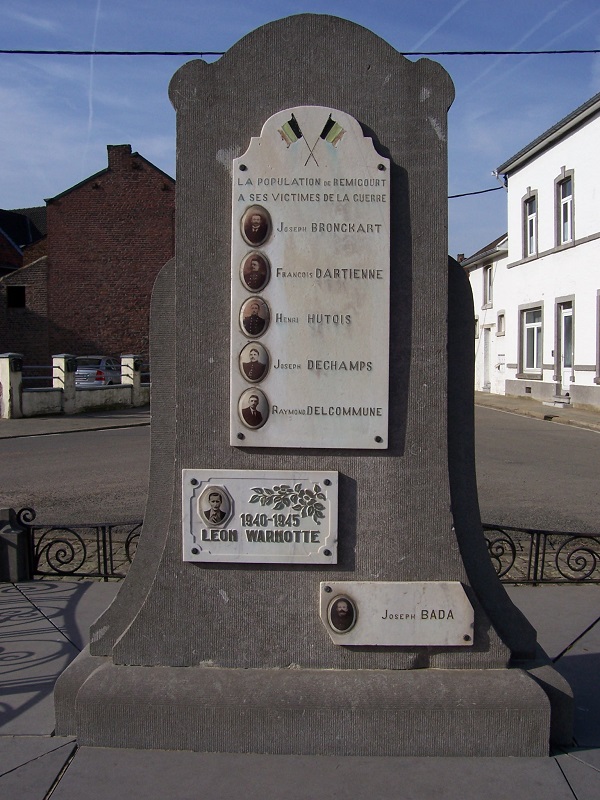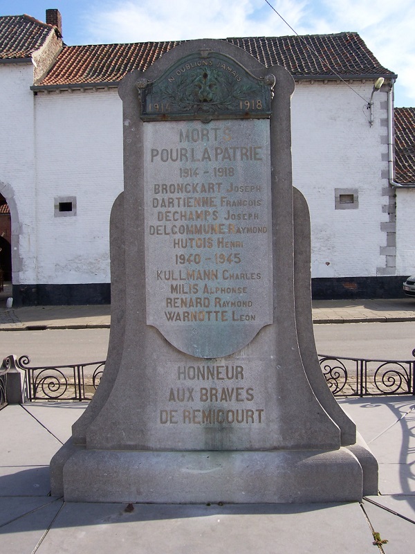 Localisation: Avenue Maurice DELMOTTE. Coordonnées GPS: +50°40'52.20", +5°19'41.50" Inscriptions Face avant "N'OUBLIONS JAMAIS 1914 - 1918 MORTS POUR LA PATRIE 1914 - 1918 [Cinq noms] 1940 - 1945 [Quatre noms]" Face arrière "LA POPULATION DE REMICOURT À SES VICTIMES DE LA GUERRE [Sept noms et photos]" Voir les noms mentionnés sur ce monument |