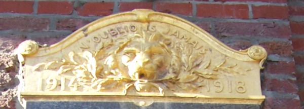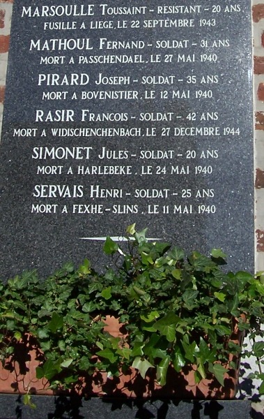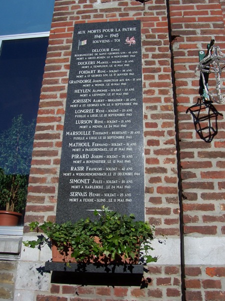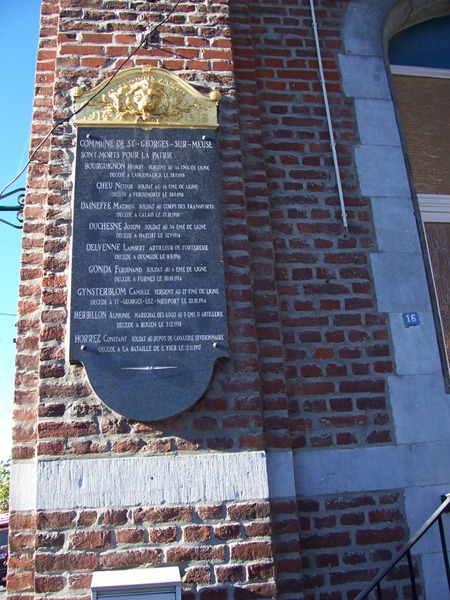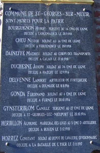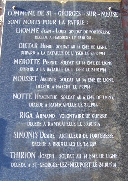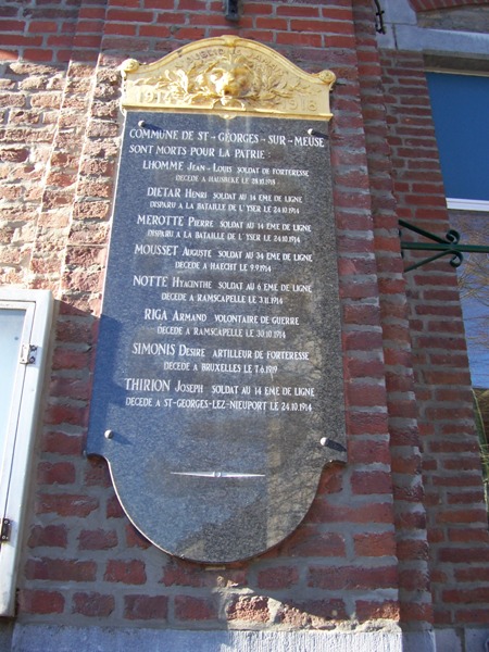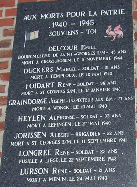 Localisation de ces plaques: Administration communale, Rue Albert Ier, 16. Coordonnées GPS: +50° 36' 2.65", +5° 21' 22.90". Inscriptions figurant sur les plaques Première plaque 1914 - 1918 "N'OUBLIONS JAMAIS 1914 - 1918 COMMUNE DE SAINT-GEORGES-SUR-MEUSE SONT MORTS POUR LA PATRIE [Neuf noms, classés par ordre alphabétique, avec indication des grade, régiment, date et lieu de décès]" Seconde plaque 1914 - 1918 "N'OUBLIONS JAMAIS 1914 - 1918 COMMUNE DE SAINT-GEORGES-SUR-MEUSE SONT MORTS POUR LA PATRIE [Huit noms, classés par ordre alphabétique, avec indication des grade, régiment, date et lieu de décès]" Plaque 1940 - 1945 "AUX MORTS POUR LA PATRIE 1940 - 1945 SOUVIENS-TOI [Quatorze noms, classés par ordre alphabétique, avec indication des grade, âge, date et lieu de décès]" Voir les noms mentionnés sur ce monument |
