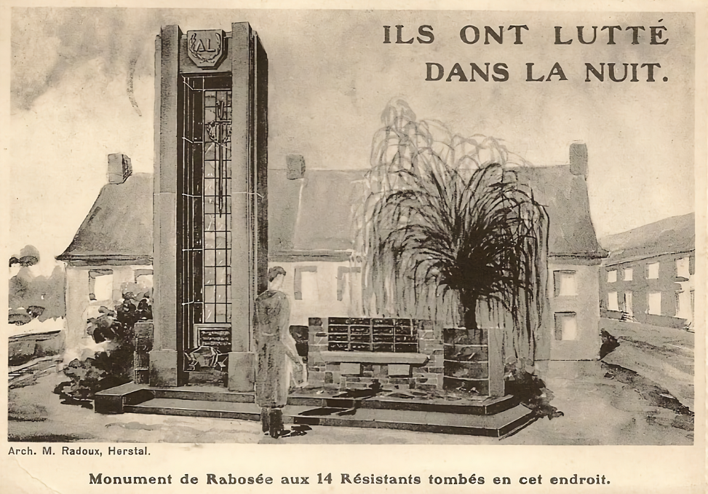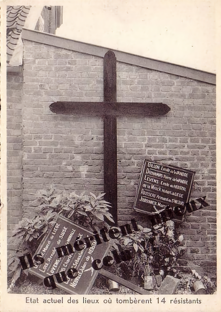 Localisation: Place des Fusillés à la Xhavée-Rabosée, commune de Saive. Coordonnées GPS: +50°39'59.05", +5°40'18.45" Inscriptions Au sommet du monument "A. L."" Plaque commémorative au pied de la tour "1940 - 1945 AUX 378 MORTS DE L'ARMÉE DE LA LIBÉRATION DONT 14 SONT TOMBÉS EN CET ENDROIT 1940 - 1945 AAN DE 378 DODEN VAN HET BEVRIJDINGSLEGER WAARONDER 14 HIER GEVALLEN ZIJN" Panneau de droite "À NOS 383 COMPAGNONS MORTS POUR LA PATRIE [Quatorze noms] ARMÉE DE LA LIBÉRATION SEPTEMBRE 1940 - OCTOBRE 1944" Plaque au pied du monument "À NOS MARTYRS LES PRISONNIERS DE LA XHAVÉE 15 - 7 - 45" Architecte : M. RADOUX, Herstal (Source: carte postale ancienne, voir ci-dessous) Voir les noms mentionnés sur ce monument |