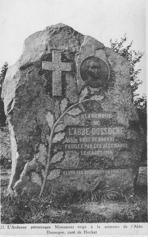 Localisation: Le long de la N 640, entre le Chemin des Halleux et Troisfontaines. Coordonnées GPS: +50°31'27.47", +5°54'23.68" Inscriptions "À LA MÉMOIRE DE L'ABBÉ DOSSOGNE CURÉ DE HOCKAI FUSILLÉ PAR LES ALLEMANDS LE 11 AOÛT 1914 ÉPARGNEZ MES PAROISSIENS PRENEZ-MOI" Informations complémentaires Sculpteur du monument: M. BOURGUIGNON Réalisation du médaillon: Mlle. Jenny LORRAIN Le monument fut inauguré le 12 août 1928 (Source [370] - pages 85 à 107) Plus d'informations concernant cette personne |