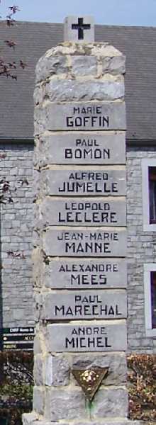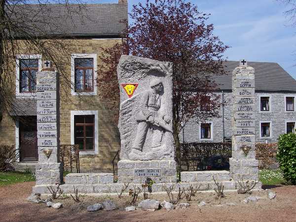 Localisation de ce monument: Place du Baty. Coordonnées GPS: 50° 27' 33" N, 5° 24' 07" E. Inscription figurant sur le monument "ARMEE SECRÈTE 1940-1945 [Pilier gauche: Huit noms] [Pilier droit: Huit noms]" Informations complémentaires Ce monument est dédié aux 15 membres de la Zone V, Secteur 3, Groupe III et au Sous-lieutenant d’active Félix PEETERMANS de la Zone V, Secteur 2, Groupement CT 9 de l’Armée Secrète. Le Sous-lieutenant Félix PEETERMANS était détaché au sein du Groupe III afin de parfaire la formation militaire des dirigeants du Groupe. Le monument a été inauguré le 23 septembre 1951 en présence de nombreuses Autorités (Source: Site de la Fraternelle royale de l'Armée secrète du CT.9). Voir les noms mentionnés sur ce monument |