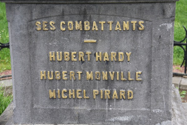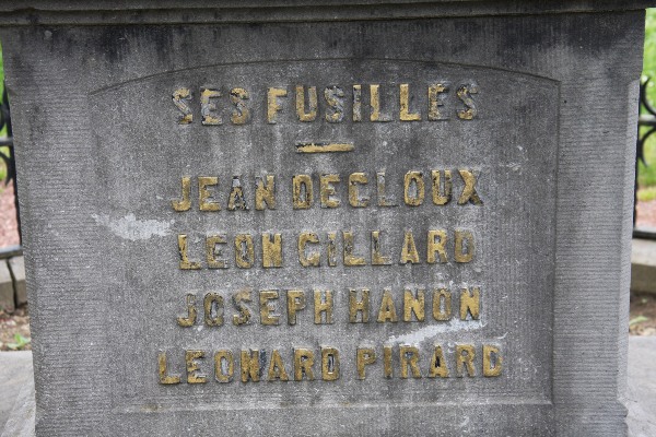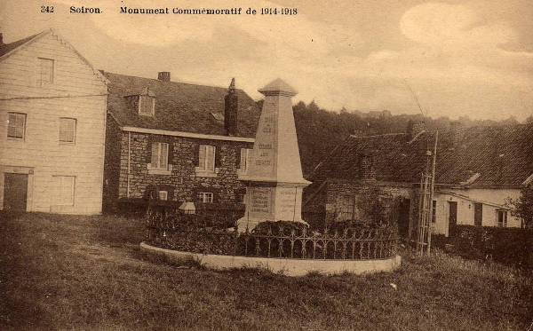 Localisation: Soiron-Centre, à proximité immédiate de l'église. Coordonnées GPS: +50° 35' 32.25", +5° 47' 24.00". Inscriptions Face avant "1914 / 1918 SOIRON À SES ENFANTS SES FUSILLÉS [Quatre noms, classés par ordre alphabétique]" Face latérale droite "SES COMBATTANTS [Trois noms, classés par ordre alphabétique]" Face latérale gauche "SES COMBATTANTS [Trois noms, classés par ordre alphabétique]" Face arrière "SES COMBATTANTS [Trois noms, classés par ordre alphabétique]" Plaque 1940 - 1945, devant le monument proprement dit "1940 - 1945 [Cinq noms, classés par ordre alphabétique]" Décision de construction: 19 mai 1919 (Source [113]) Inauguration: Monument : 16 mai 1920 (Source [113]) Stèle 1940-1945 : 3 mai 1951 (Source: Bulletin des Amis du Ban de Soiron) Architecte: BASTIN, Franz (Source [113]) Sculpteur: DELREZ, Jean (Source [113]) Entrepreneur: DELREZ, Jean (Source [113]) Commanditaire: L'administration communale (Source [113]) Prix: 4.575 francs Financement: Souscriptions publiques et subsides de l’administration communale (Source [113]) Par ailleurs, on trouve dans le cimetière communal la sépulture d'une victime civile de la guerre 1914-1918. Son nom a été ajouté dans la base de données Plus d'informations concernant les deux guerres à Soiron: Soiron à travers les âges Voir les noms mentionnés sur ce monument |