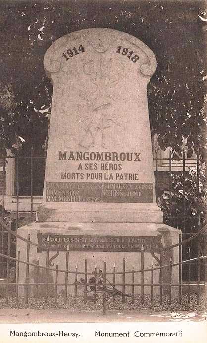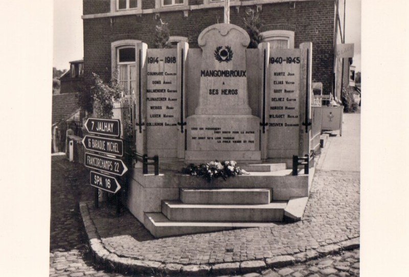 Localisation: À l'angle de la Rue de Jalhay (N672) et de l'Avenue Reine Astrid (N640), à côté de l'église de l'Immaculée Conception. Coordonnées GPS: +50°35'00.15", +5°53'14.30" Inscriptions Partie centrale "MANGOMBROUX À SES HÉROS CEUX QUI PIEUSEMENT SONT MORTS POUR LA PATRIE ONT DROIT QU'À LEUR TOMBEAU LA FOULE VIENNE ET PRIE" Partie gauche "1914-1918 [Sept noms, classés par ordre alphabétique sauf les deux derniers]" Partie droite "1940-1945 [Sept noms, non classés par ordre alphabétique]" Voir les noms mentionnés sur ce monument |