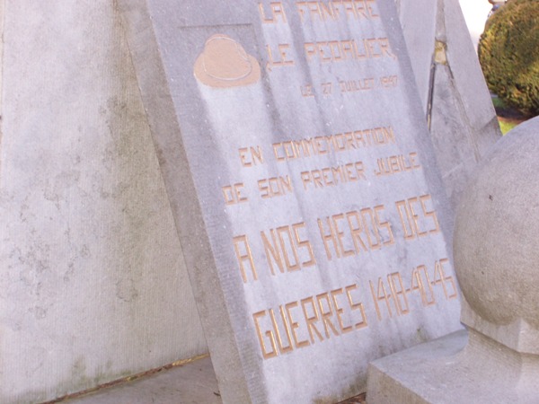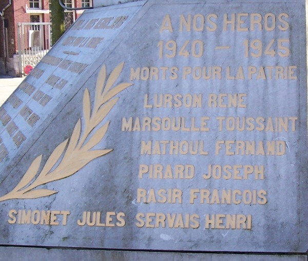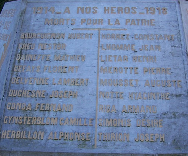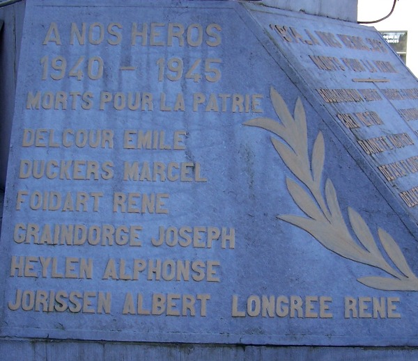 Localisation de ce monument: À l'intersection des rues Basse Marquet et Reine Astrid. Coordonnées GPS: +50° 34' 58.19", +5° 21' 26.40". Inscriptions figurant sur le monument Face avant "PATRIE 1914 - À NOS HÉROS - 1918 MORTS POUR LA PATRIE [Dix-huit noms, classés par ordre alphabétique sur deux colonnes]" Face latérale gauche "À NOS HÉROS 1940 - 1945 MORTS POUR LA PATRIE [Sept noms, classés par ordre alphabétique]" Face latérale droite "À NOS HÉROS 1940 - 1945 MORTS POUR LA PATRIE [Sept noms, classés par ordre alphabétique]" Plaque ajoutée 1 "LA FANFARE LE PÉDALIER LE 27 JUILLET 1947 EN COMMÉMORATION DE SON PREMIER JUBILÉ À NOS HÉROS DES GUERRES 14-18 - 40-45" Plaque ajoutée 2 "À NOS BRAVES 1914 - 1918 CERCLE LES XXI. SOUVENIR LIÉGEOIS FONDÉ LE 5 AOÛT 1916" Voir les noms gravés sur ce monument |