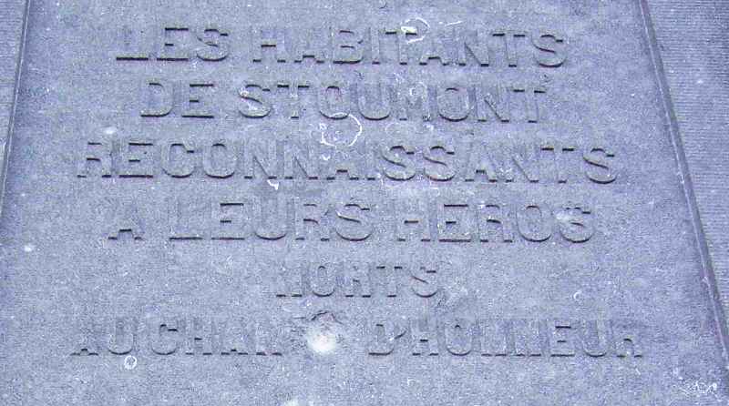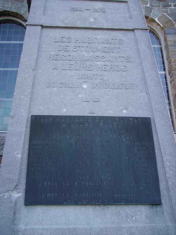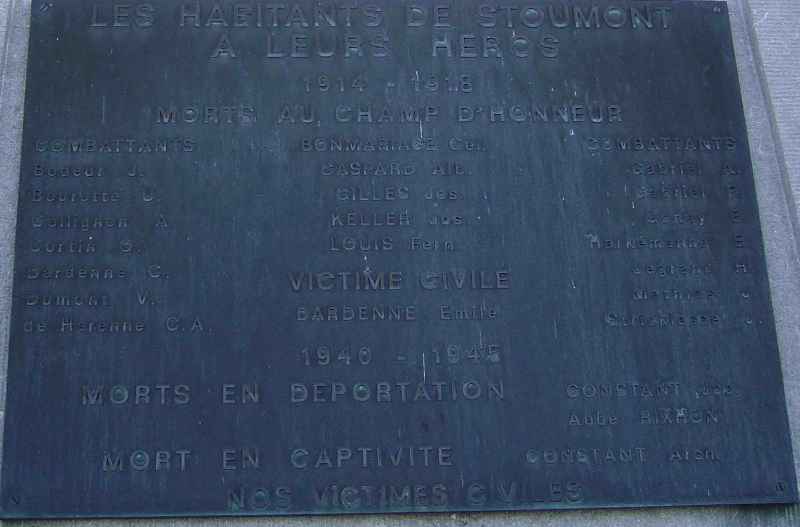 Localisation de ce monument: Sur le côté de l'église, située route de l'Amblève (Grand'route Remouchamps - Trois Ponts). Coordonnées GPS: 50° 24' 21.26 N, 5° 48' 32.90"E Inscriptions figurant sur le monument "1914 - 1918 LES HABITANTS DE STOUMONT RECONNAISSANTS À LEURS HÉROS MORTS AU CHAMP D'HONNEUR LES HABITANTS DE STOUMONT À LEURS HÉROS 1914 - 1918 MORTS AU CHAMP D'HONNEUR" [Cinq noms] COMBATTANTS [Quatorze noms] VICTIME CIVILE [Un nom] 1940 - 1945 MORTS EN DÉPORTATION [Deux noms] MORT EN CAPTIVITÉ [Un nom] NOS VICTIMES CIVILES" Faces latérales "VIVANTS [Sept noms] [Huit noms]" Réalisation du monument: PIRET-HUBIN de Sprimont, LG, BE Voir les noms mentionnés sur ce monument |