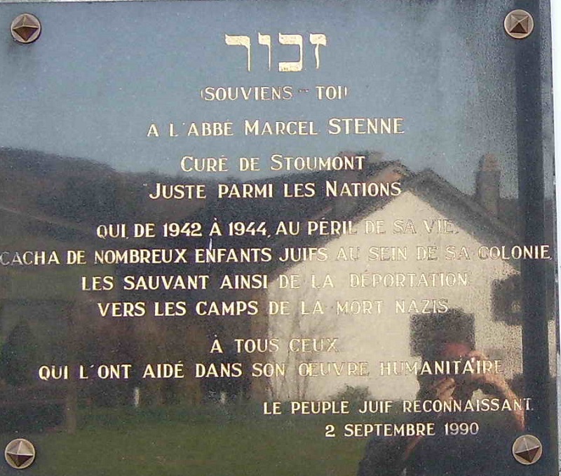 Localisation de ce monument: Sur le côté de l'église, située route de l'Amblève (Grand'route Remouchamps - Trois Ponts), juste à côté du monument aux morts. Coordonnées GPS: 50° 24' 21.26 N, 5° 48' 32.90"E. Inscription figurant sur le monument "SOUVIENS-TOI À L'ABBÉ MARCEL STENNE CURÉ DE STOUMONT JUSTE PARMI LES NATIONS QUI DE 1942 A 1944, AU PÉRIL DE SA VIE CACHA DE NOMBREUX ENFANTS JUIFS AU SEIN DE SA COLONIE LES SAUVANT AINSI DE LA DÉPORTATION VERS LES CAMPS DE LA MORT NAZIS À TOUS CEUX QUI L'ONT AIDÉ DANS SON ŒUVRE HUMANITAIRE LE PEUPLE JUIF RECONNAISSANT 2 SEPTEMBRE 1990" Plus d'informations concernant cette personne |