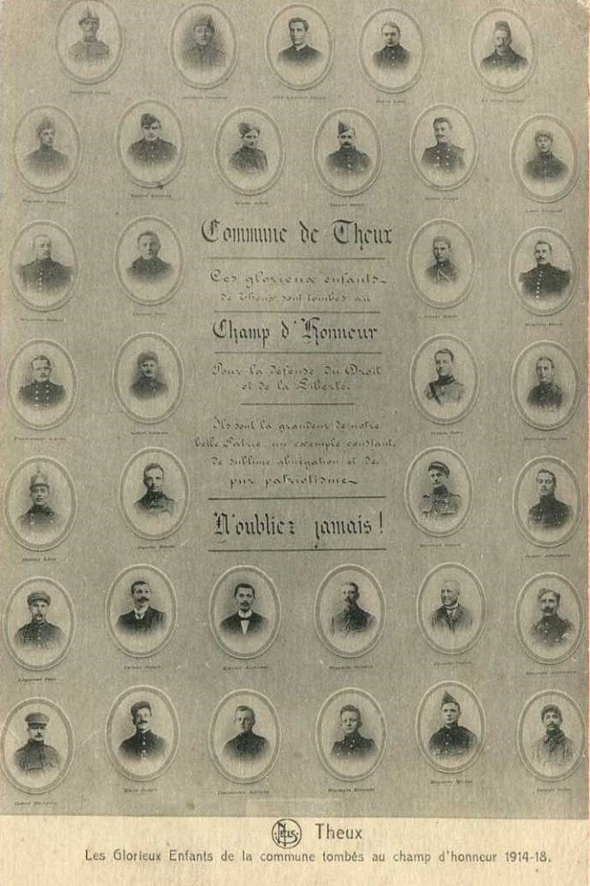 Localisation de ce document: Maison communale, place du Perron. Coordonnées GPS: +50°32'05.72", +5°48'47.54". Inscriptions figurant sur le document "COMMUNE DE THEUX CES GLORIEUX ENFANTS DE THEUX SONT TOMBÉS AU CHAMP D'HONNEUR POUR LA DÉFENSE DU DROIT ET DE LA LIBERTÉ ILS SONT LA GRANDEUR DE NOTRE BELLE PATRIE, UN EXEMPLE CONSTANT DE SUBLIME ABNÉGATION ET DE PUR PATRIOTISME N'OUBLIEZ JAMAIS ! [Trente-cinq noms, non classés par ordre alphabétique, avec photos]" Voir les noms cités sur ce document |