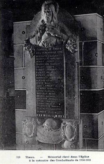 Localisation de ce monument: Église des Saints Hermes et Alexandre, rue de la Chaussée, en face du monument aux 600 Franchimontois. Coordonnées GPS: +50°32'05.44",+5°48'41.61". Inscription sur le monument "PAROISSE DE THEUX 1914 - IN MEMORIAM - 1918 [Vingt-et-un noms, classés par ordre alphabétique] [Un nom] [Un nom] EX VOTO SACRATISSIMO COR DI JESU FACTO 9-10-11 AUGUSTI 1914 HANC ENIM CUSTODIVIT CIVITATEM" Voir les noms gravés sur ce monument |