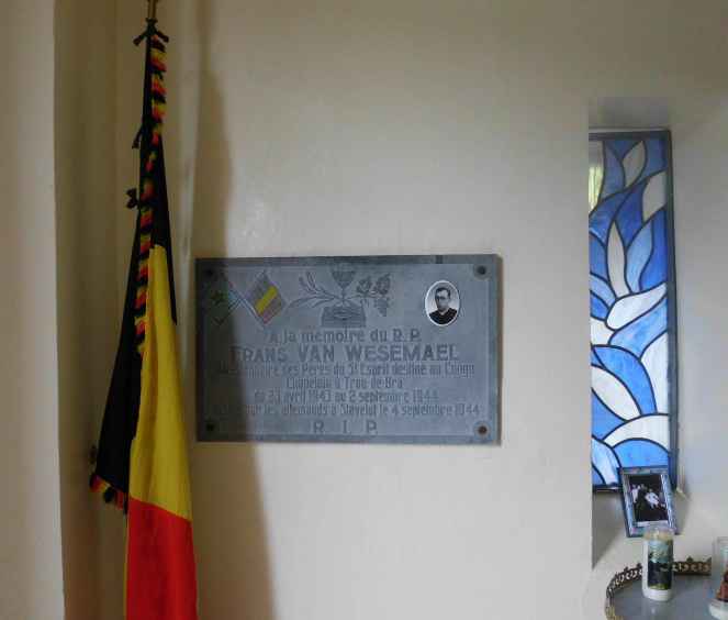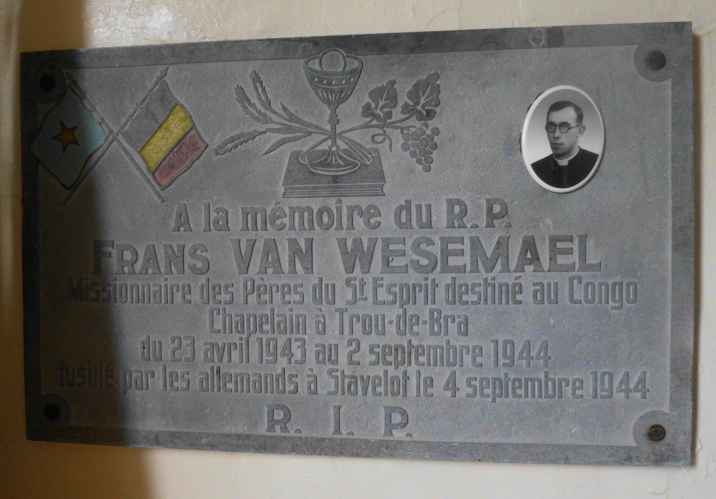 Localisation de cette plaque: Dans l'entrée de l'église, Fond Lienne (N 645). Coordonnées GPS: +50°20'46.38", +5°43'44.90". Inscription figurant sur la plaque "À LA MÉMOIRE DU R.P. FRANS VAN WESEMAEL MISSIONNAIRE DES PÈRES DU ST ESPRIT DESTINÉ AU CONGO CHAPELAIN À TROU-DE-BRA DU 23 AVRIL 1943 AU 2 SEPTEMBRE 1944 FUSILLÉ PAR LES ALLEMANDS À STAVELOT LE 4 SEPTEMBRE 1944 R.I.P." Plus d'informations concernant cette personne |