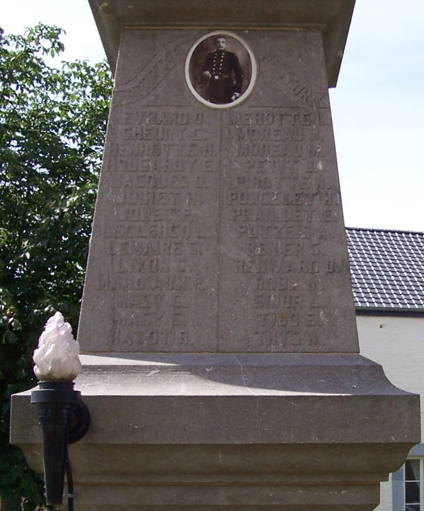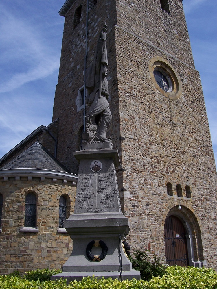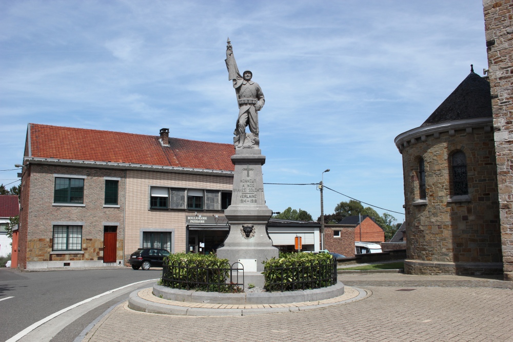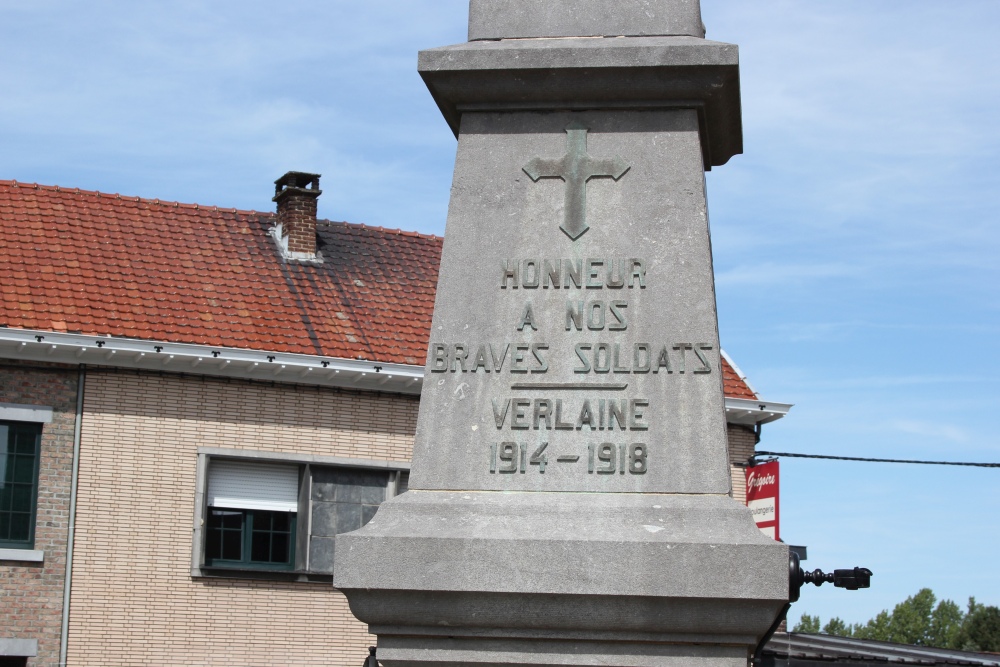 Localisation: Rue de l'Eglise, devant celle-ci. Coordonnées GPS: 50° 36' 29" N, 5° 19' 04"E Inscriptions Face avant "HONNEUR À NOS BRAVES SOLDATS VERLAINE 1914-1918" Plaque sur le socle "FÊTES / DU / CENTENAIRE 3 AOÛT 1930 HOMMAGE À NOS FRÈRES D'ARMES MORTS POUR LA PATRIE" Faces latérales "[Vingt-huit noms] [Vingt-neuf noms]" Face arrière "[Deux noms]" Sculpteur: Joseph SPRUMONT, Ouffet (signé). Voir les noms mentionnés sur ce monument |