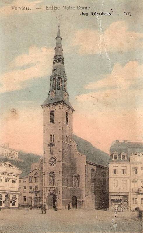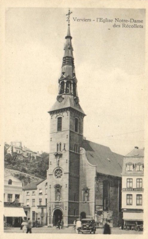 Localisation de ce mémorial: Place du Martyr, dans le narthex de l'église Notre-Dame des Récollets. Coordonnées GPS: +50°35'39.42", +5°51'32.37" Inscriptions figurant sur le mémorial Sur la plaque du dessus "PRIONS POUR NOS GLORIEUX MORTS" Sur la plaque centrale "1914 1918 À MARIE MÈRE DE MISÉRICORDE PROTECTRICE DE VERVIERS AMOUR RECONNAISSANCE FIDÉLITÉ" Sur la plaque latérale gauche "1914 [Trois noms, non classés par ordre alphabétique] 1915 [Six noms, non classés par ordre alphabétique] 1916 [Un nom]" Sur la plaque latérale droite "1917 [Trois noms, non classés par ordre alphabétique] 1918 [Huit noms, non classés par ordre alphabétique]" À la base du mémorial "DIEU PATRIE" Informations complémentaires: Le mémorial, non signé, est placé dans le narthex de l’église. Il consiste en quatre plaques de marbre blanc et quelques inserts de marbre noir, dans un encadrement de marbre rouge et de bois. La plaque centrale porte un écu couronné au lion couronné réalisé en stuc (Source [276]) On trouve également à l'intérieur de l'église un panneau avec de nombreux ex-votos de remerciement ou de reconnaissance (voir les photos ci-dessous) Voir les noms mentionnés sur ce mémorial |