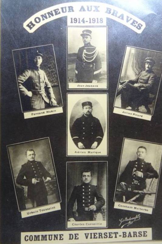 Localisation: Collection privée. Inscriptions figurant sur la photo-souvenir "HONNEUR AUX BRAVES 1914 - 1918 [Sept photos, avec prénom et nom] COMMUNE DE VIERSET-BARSE" Voir les noms mentionnés sur cette photo-souvenir |