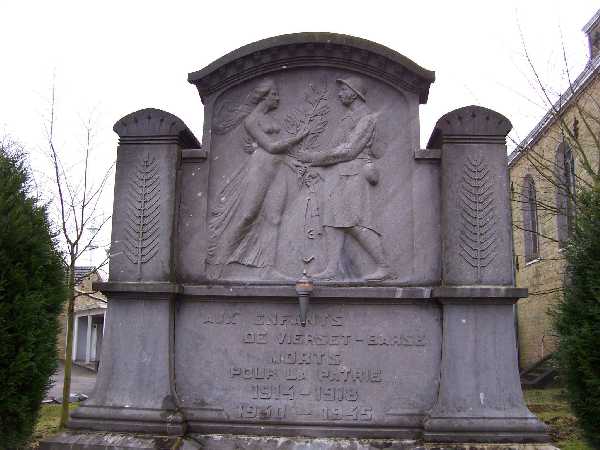 Localisation: Place HUBIN Georges, à la gauche de l'église. Coordonnées GPS: +50° 28' 58.92", +5° 17' 52.54". Inscription figurant sur le monument Sur la face avant "AUX ENFANTS DE VIERSET-BARSE MORTS POUR LA PATRIE 1914 - 1918 1940 - 1945" Sur une des faces latérales "[Huit noms, classés par conflit et par date de décès]" Sur l'autre face latérale "[Neuf noms, classés par conflit et par date de décès]" Par ailleurs, on trouve, dans le cimetière communal, la sépulture d'une victime civile de 1940-1945. Son nom a été ajouté dans la base de données Voir les noms mentionnés sur ce monument |