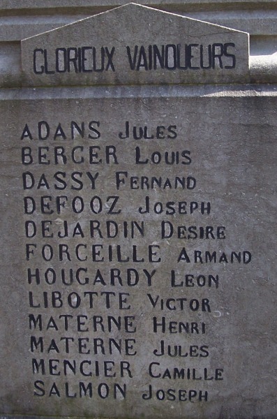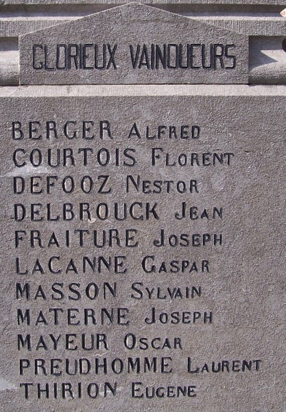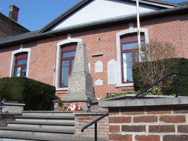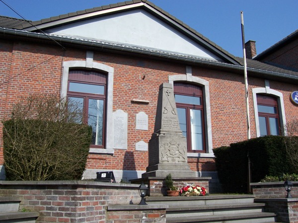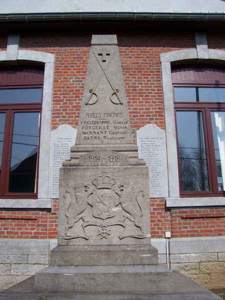 Localisation de ce monument: Devant l'école, rue de la Crosse. Coordonnées GPS: +50° 39' 25.80", +5° 05' 39.71". Inscription figurant sur le monument Face avant "NOBLES MARTYRS [Quatre noms, non classés par ordre alphabétique] 1914 - 1918" Face latérale droite "GLORIEUX VAINQUEURS [Onze noms, classés par ordre alphabétique]" Face latérale gauche "GLORIEUX VAINQUEURS [Douze noms, classés par ordre alphabétique]" Voir les noms mentionnés sur ce monument |