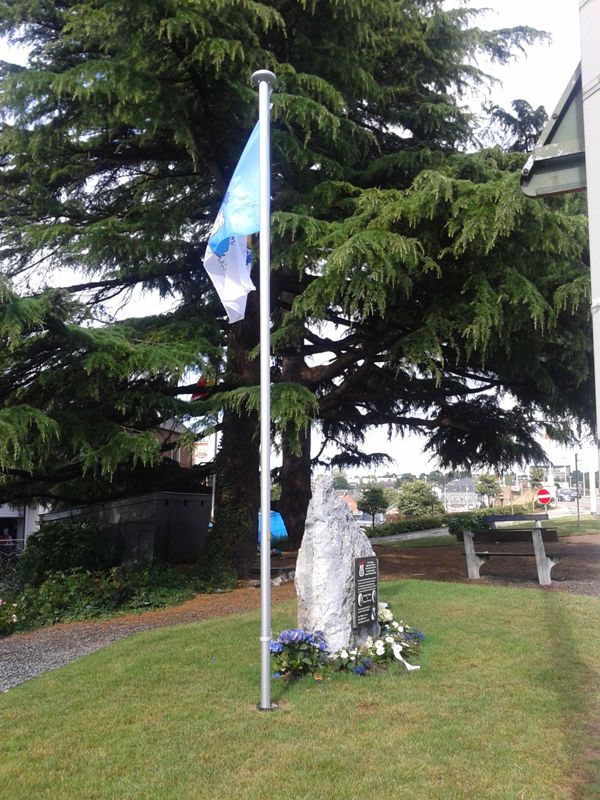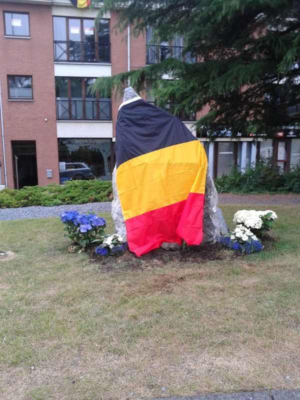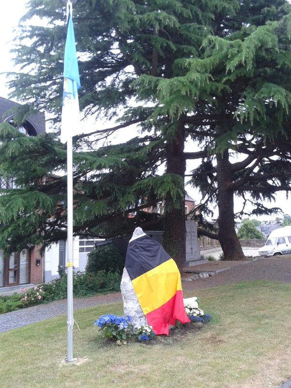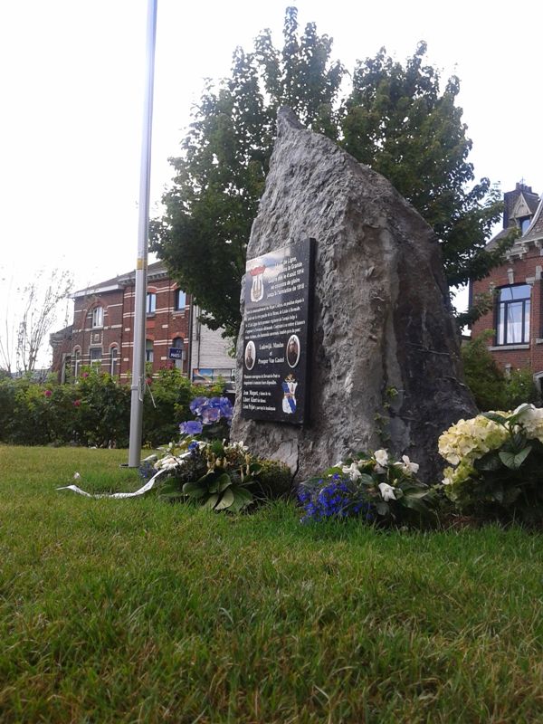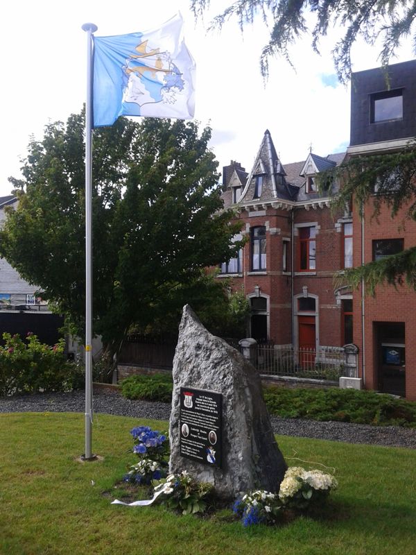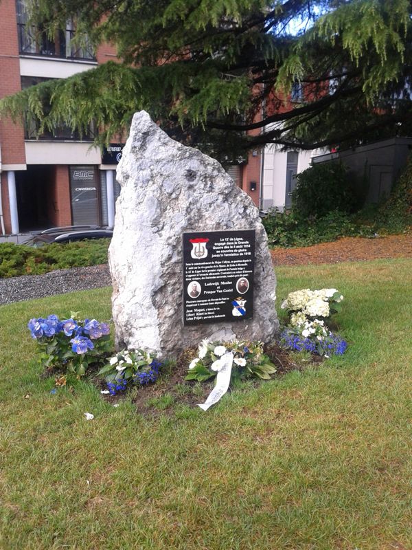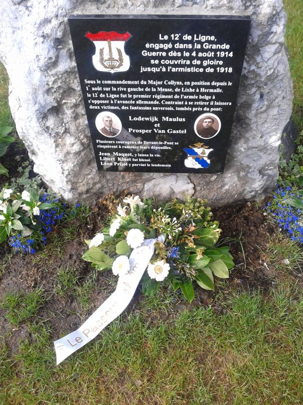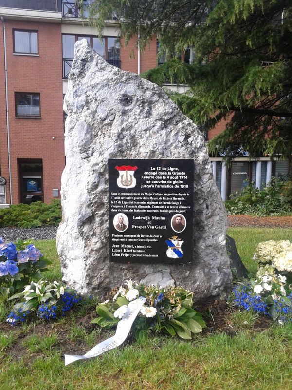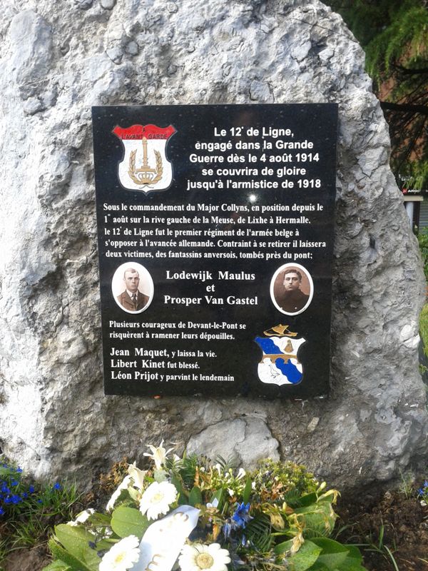 Localisation: Quartier de Devant-le-Pont, à la fin de l'avenue Franklin ROOSEVELT, juste avant le Pont Baudouin. Coordonnées GPS: +50°44'14.2", +5°41'17.7" Inscriptions "LE 12E DE LIGNE, ENGAGÉ DANS LA GRANDE GUERRE DÈS LE 4 AOÛT 1914 SE COUVRIRA DE GLOIRE JUSQU'À L'ARMISTICE DE 1918 SOUS LE COMMANDEMENT DU MAJOR COLLYNS, EN POSITION DEPUIS LE 1ER AOÛT SUR LA RIVE GAUCHE DE LA MEUSE, DE LIXHE À HERMALLE, LE 12E DE LIGNE FUT LE PREMIER RÉGIMENT DE L'ARMÉE BELGE À S'OPPOSER À L'AVANCÉE ALLEMANDE. CONTRAINT À SE RETIRER IL LAISSERA DEUX VICTIMES, DES FANTASSINS ANVERSOIS, TOMBÉS PRÈS DU PONT; LODEWIJK MAULUS ET PROPSER VAN GASTEL PLUSIEURS COURAGEUX DE DEVANT-LE-PONT SE RISQUÈRENT À RAMENER LEURS DÉPOUILLES. JEAN MAQUET, Y LAISSA LA VIE. LIBERT KINET FUT BLESSÉ. LÉON PRIJOT Y PARVINT LE LENDEMAIN" Description Le bloc de roche qui prendant près de 70 ans remplaça devant la poste de Visé le monument dédié aux gendarmes Bouko et Thill détruit en 1942, a trouvé une nouvelle affectation. C'est à Devant-le-Pont que la pierre a pris place, munie d'une autre stèle rappelant le 12e de Ligne et certains Devant-le-Pontois. La ville de Visé avait accepté le projet, et l'échevinat des travaux a mis le rocher en place ainsi que la hampe de drapeau où flotteront les couleurs devant-le-pontoises. Le reste fut du ressort de Marc POELMANS qui dès 2014, lorsqu'il fut à l'initiative de la restauration dans son aspect d'origine du monument aux gendarmes, avait déjà imaginé et conçu ce nouveau projet et qui a offert à la communauté devant-le-pontoise la plaque commémorative placée peu de temps avant l'inauguration. C'est l'atelier Marquet qui s'est chargé de la gravure qui reprend le blason du 12e de Ligne et celui de Devant-le-Pont, ainsi que les noms des Devant-le-Pontois qui se sont illustrés dans les premières heures de la guerre. Lorsque les fantassins du 12e de Ligne, MAULUS et VAN GASTEL, dont les photos illustrent la plaque, sont tombés, Jean MAQUET tenta de leur porter secours et de ramener leurs dépouilles. Il récoltera la mort dans son acte héroïque, les Allemands tiraient toujours d'en face. Libert KINET fut blessé dans les mêmes circonstances et devant l'acharnement de l'ennemi ce n'est que le lendemain que Léon PRIJOT y parvint lorsque le feu fut moins intense (Source [246]). Inauguration: 20 juillet 2015. Plus d'informations sur les personnes mentionnées sur le monument |