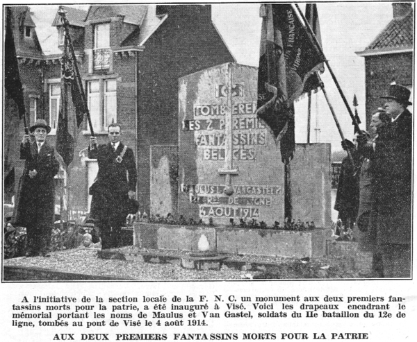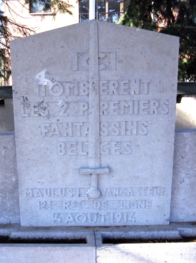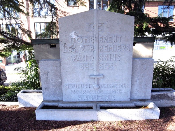 Localisation de ce monument: Quartier de Devant-le-Pont, à la fin de l'avenue Franklin ROOSEVELT, juste avant le Pont Baudouin. Coordonnées GPS: +50°44'14.2", +5°41'17.7" Inscription figurant sur le monument "ICI TOMBÈRENT LES 2 PREMIERS FANTASSINS BELGES MAULUS L. _ VAN GASTEL P. 12E RGT DE LIGNE 4 AOÛT 1914" Inauguration: Avril 1936. Plus d'informations concernant ces soldats |