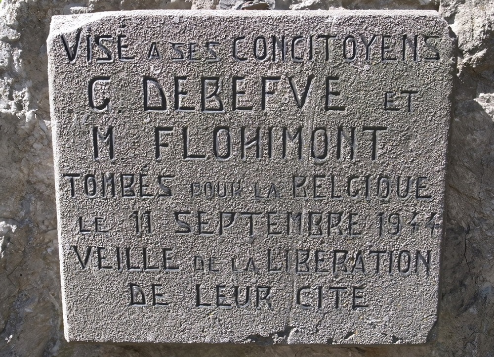 Localisation: Rue de Jupille, face au n° 83 et à la rue du Pavillon. Coordonnées GPS: +50°43'42.1", +5°41'37.6" Inscriptions "VISÉ À SES CONCITOYENS G. DEBEFVE ET M. FLOHIMONT TOMBÉS POUR LA BELGIQUE LE 11 SEPTEMBRE 1944 VEILLE DE LA LIBÉRATION DE LEUR CITÉ" Plus d'informations concernant ces victimes |