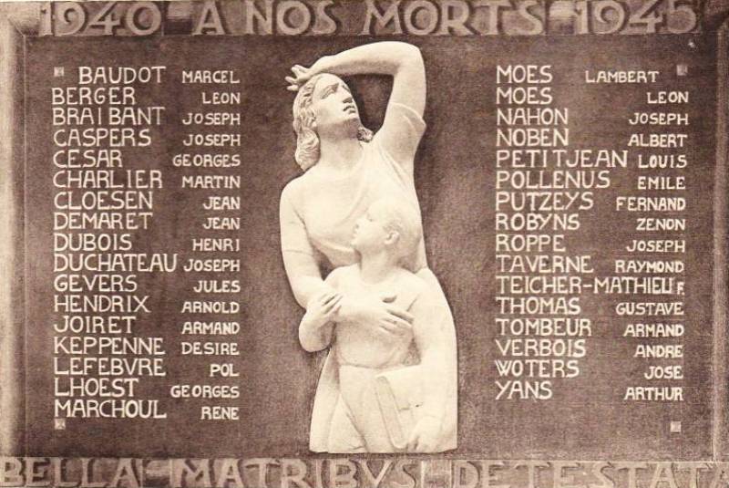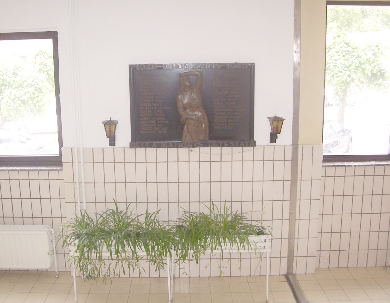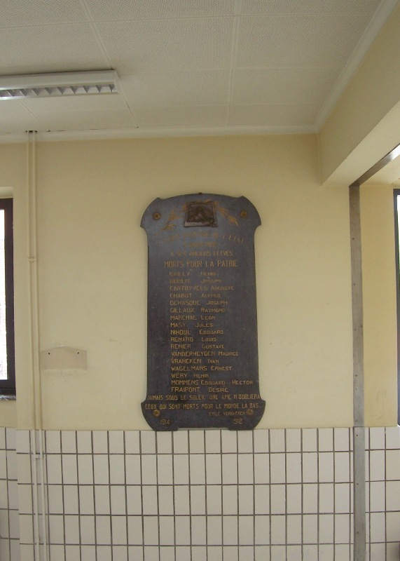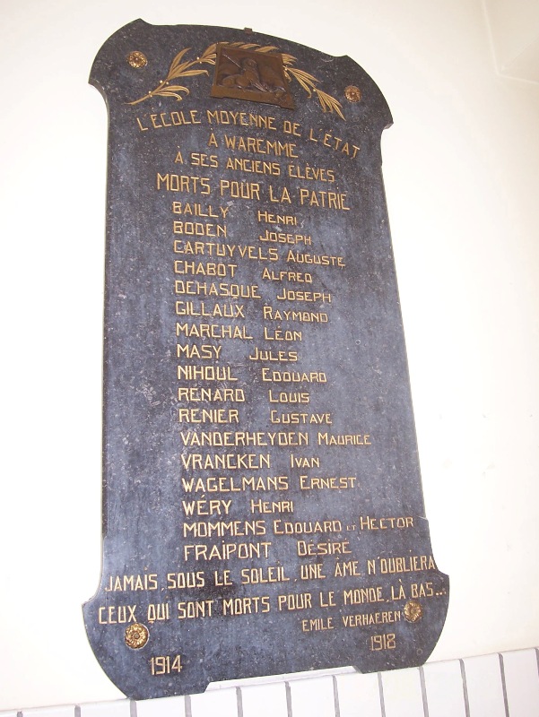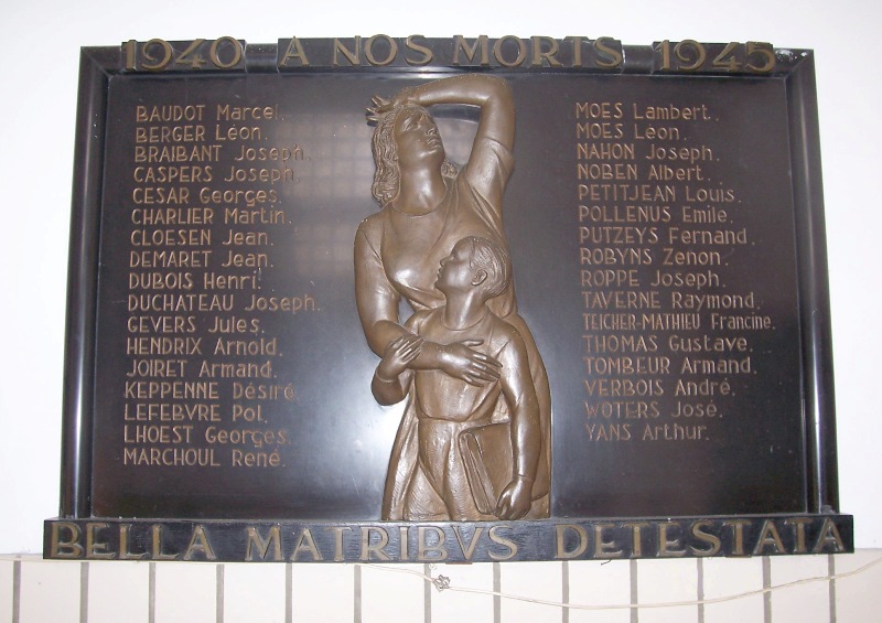 Localisation de ce monument: Dans le hall d'entrée de l'Athénée de Waremme à l'intersection de l'avenue Guillaume Joachim et de la rue Gustave RENIER. Coordonnées GPS: +50°41'42.66", +5°15'13.90". Inscriptions figurant sur les plaques Plaque 1914 - 1918 "L'ÉCOLE MOYENNE DE L'ÉTAT À WAREMME À SES ANCIENS ÉLÈVES MORTS POUR LA PATRIE [Dix-huit noms, classés par ordre alphabétique, sauf deux] JAMAIS SOUS LE SOLEIL, UNE ÂME N'OUBLIERA CEUX QUI SONT MORTS POUR LE MONDE? LÀ-BAS... ÉMILE VERHAEREN 1914 1918" Plaque 1940 - 1945 "1940 À NOS MORTS 1945 [Trente-trois noms, classés par ordre alphabétique] BELLA MATRIBUS DETESTATA" Remarques complémentaires "Bella matribus detestata" signifie littéralement "les guerres que les mères abhorrent". Ce ver est tiré du Livre I, Ode i d'Horace. Le texte complet est le suivant: "Multos castra juvant, et lituo tubæ Permixtus sonitus, bella que matribus Detestata" "Beaucoup aiment les camps, le son du clairon mêlé au bruit de la trompette, les guerres détestées des mères" En matière de détestation de la guerre, on peut rapprocher ces vers de ceux d'Auguste BARBIER: "Ce bronze que jamais ne regardent les mères Ce bronze grandi sous leurs pleurs" (tiré de "L'idole", recueil "IAMBES") Voir les noms mentionnés sur ce monument |