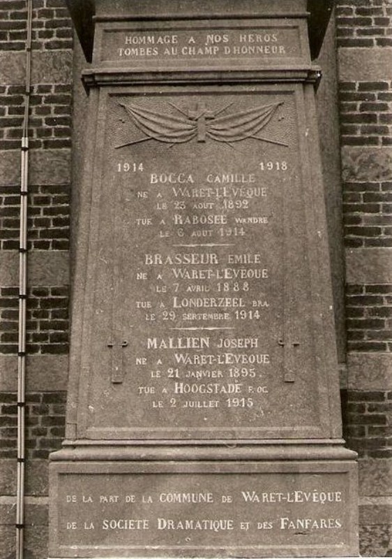 Localisation de ce monument: Devant l'école communale, chaussée de Wavre. Coordonnées GPS: +50°33'02.04", +5°03'35.40". Inscription figurant sur le monument Face avant "HOMMAGE À NOS HÉROS TOMBÉS AU CHAMP D'HONNEUR 1914 1918 [Trois noms, classés par ordre alphabétique] DE LA PART DE LA COMMUNE DE WARET-L'ÉVÊQUE DE LA SOCIÉTÉ DRAMATIQUE ET DES FANFARES" Face gauche "GLOIRE À NOS MARTYRS VICTIMES DE LA GUERRE [Quatre noms, non classés par ordre alphabétique]" Face droite "HONNEUR À NOS SOLDATS MORTS POUR LA PATRIE [Quatre noms, classés par ordre chronologique de décès]" Plaque de droite "VICTIME DU BOMBARDEMENT [Un nom]" Plaque de gauche "SOLDATS TOMBÉS AU CHAMP D'HONNEUR [Deux noms, classés par ordre alphabétique]" Voir les noms mentionnés sur ce monument |