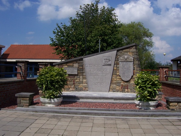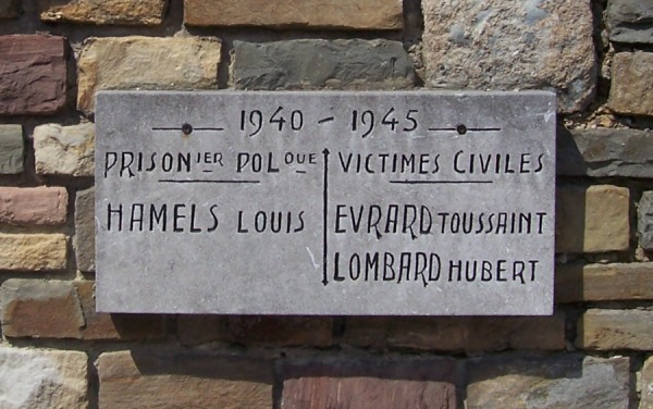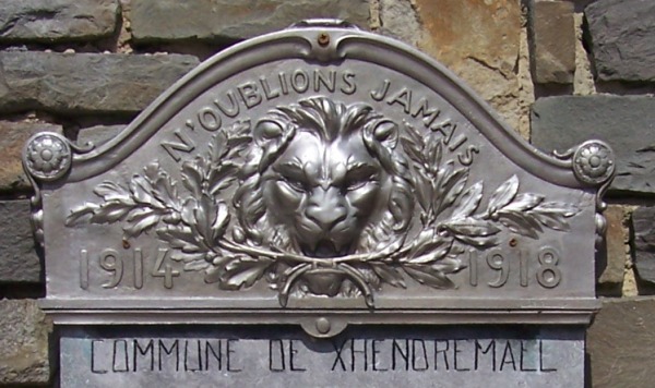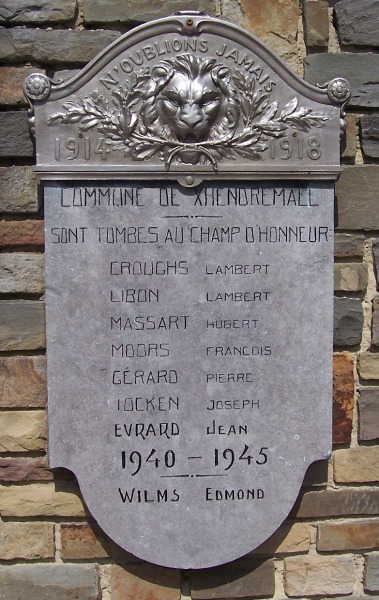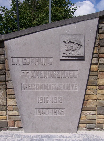 Localisation de ce monument: Rue du Paradis. Coordonnées GPS: +50° 42' 11.20", +5° 29' 01.22". Inscription figurant sur le monument Panneau central "[Haut-relief représentant deux figures de soldats] LA COMMUNE DE XHENDREMAEL RECONNAISSANTE 1914 - 1918 1940 - 1945" Panneau gauche "1940 - 1945 PRISONIER POLQUE [Un nom] VICTIMES CIVILES [Deux noms classés par ordre alphabétique]" Panneau droit "N'OUBLIONS JAMAIS 1914 - 1918 COMMUNE DE XHENDREMAEL SONT TOMBÉS AU CHAMP D'HONNEUR [Sept noms, non classés par ordre alphabétique] 1940 - 1945 [Un nom]" Architecte: Maurice BAR, Lincé-Sprimont (signé) Voir les noms gravés sur ce monument (y compris une tombe individuelle dans le cimetière pour une victime non mentionnée sur le monument aux morts) |