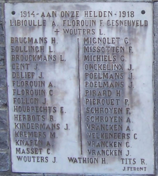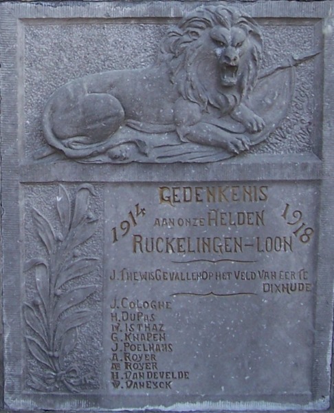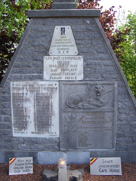 Situering van het monument: Kruispunt Bovelingenstraat / Kloosterstraat. GPS-coördinaten: 50° 44' 17" N, 5° 15' 22" E. Opschriften op het monument "AAN / ONZE HELDEN GEVALLEN IN / 1914-1918 [Twee namen] [Foto Koning ALBERT 1ste] 1934 HULDE VAN DE OUDSTRYDERS AAN HUN DIERBAREN KONING R I P AAN ONZE GESNEUVELDE / HELDEN 1940 1945 [Drie namen] 1914 – AAN ONZE HELDEN – 1918 [Vierendertig namen] 1914 1918 GEDENKENIS AAN ONZE RUCKELINGEN-LOON [Tien namen]" Beeldhouwer: J. FERONT Zie namen gebeiteld op het monument |