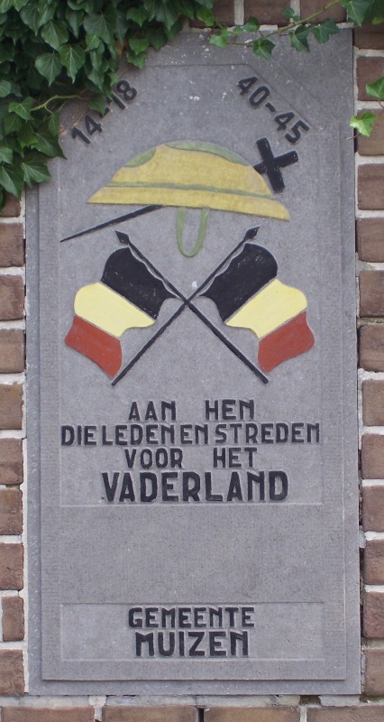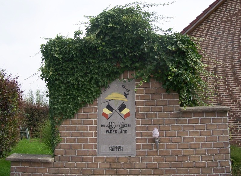Situering: Kaneelstraat. GPS-coördinaten: +50°45'37.33", +5°10'37.63". Opschriften op het monument "14-18 40-45 AAN HEN DIE LEDEN EN STREDEN VOOR HET VADERLAND GEMEENTE / MUIZEN" Er staan geen namen gebeiteld op het monument |