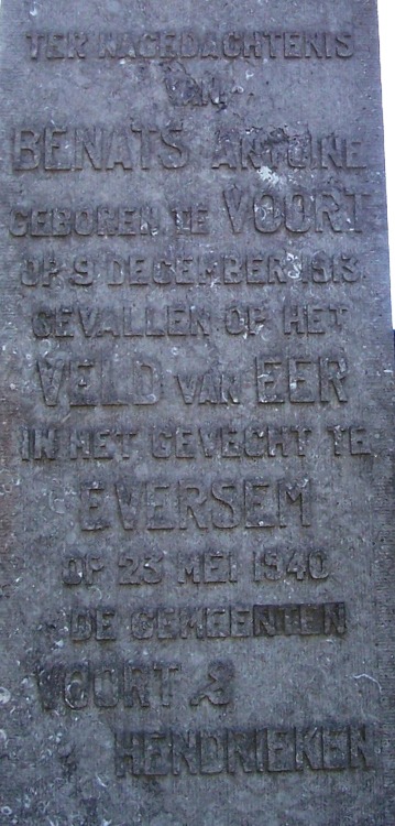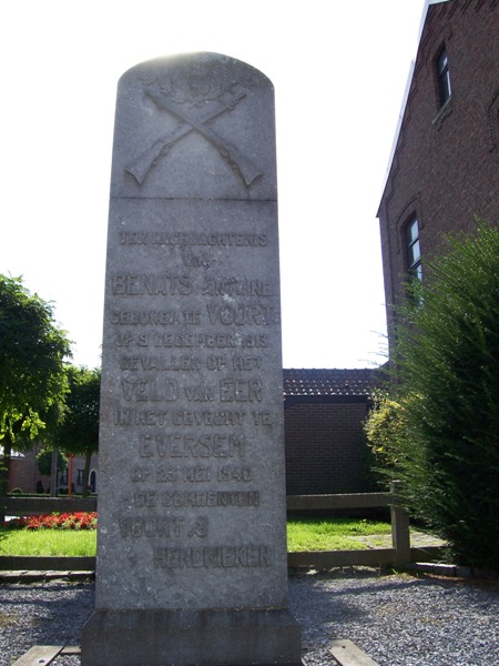 Situering: Kruising Benaetsstraat en Valgaarstraat. GPS-coördinaten: +50°47'43.85", +5°19'18.38". Opschriften op het monument "TER NAGEDACHTENIS VAN [Één naam, met vermelding van geboortedatum en -plaats en overlijdensdatum en -plaats] DE GEMEENTEN VOORT & HENDRIEKEN" Meer info over deze gesneuvelde |