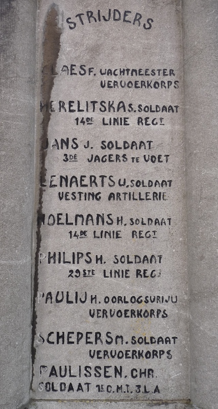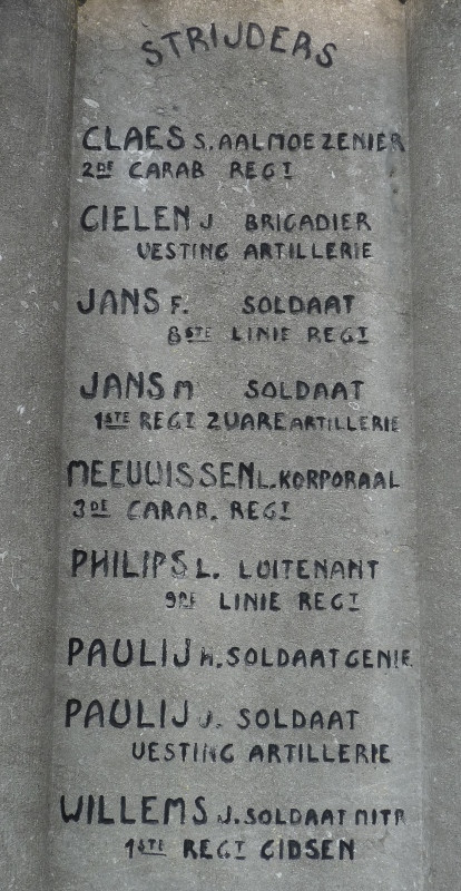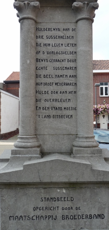 Ligging: Misweg, voor de Sint-Genovevakerk. GPS-coördinaten: +50°47'52.97", +5°37'59.14" Opschriften Voorkant "EENDRACHT MAAKT MACHT 1914 + 1918 GESNEUVELD VOOR HET VADERLAND [Drie namen, naar overlijdensdatum gerangschikt, met foto en vermelding van regiment en overlijdensdatum en -plaats] 1940 - 1945 [Één naam, met foto en vermelding van regiment en overlijdensdatum en -plaats]" Zijkant 1 "STRIJDERS [Negen namen, alfabetisch gerangschikt, met vermelding van rang en regiment] 1940 - 1945 [Één naam, met foto en vermelding van regiment en overlijdensdatum en -plaats]" Zijkant 2 "STRIJDERS [Negen namen, alfabetisch gerangschikt, met vermelding van rang en regiment] 1940 - 1945 [Één naam, met foto en vermelding van regiment en overlijdensdatum en -plaats]" Achterkant "HULDEBEWYS AAN DE DRIE SUSSENHELDEN DIE HUN LEVEN LIETEN OP D'OORLOGSVELDEN BEWYS GEBRACHT DOOR ECHTE SUSSENAREN DIE DEEL NAMEN AAN HUN DROEF WEDERVAREN HULDE OOK AAN HEN DIE OVERBLEVEN EN DEN VYAND MOEDIG 'T LAND UITDREVEN STANDBEELD OPGERICHT DOOR DE MAATSCHAPPIJ BROEDERBAND" Zie namen op het gedenkteken |