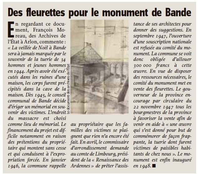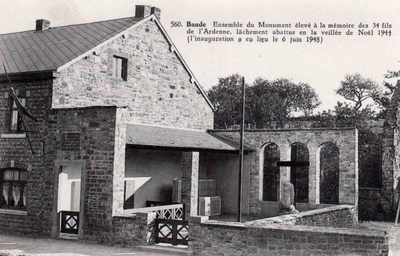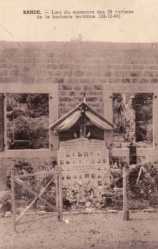 Localisation: Sur la Nationale 4 à Bande, entre Marche-en-Famenne et Bastogne. Coordonnées GPS: +50°09'42.27", +5°24'22.83". Mention figurant sur la pierre portant le nom des 34 personnes assassinées "CEUX QUI PIEUSEMENT SONT MORTS POUR LA PATRIE [Trente-quatre noms, classés par ordre alphabétique sur trois colonnes]". Mention figurant sur le panneau se trouvant dans le jardin contigu "BANDE. INCENDIÉ PAR ORDRE DU GÉNÉRAL ALLEMAND LUDOVICH LE 7 SEPT. 1944. BURNED DOWN BY ORDER OF GERMAN GENERAL LUDOVICH ON SEPT : 7 : 1944" Mention figurant sur le mémorial se trouvant dans la cave "HOMMAGE DE PIEUSE RECONNAISSANCE AUX MARTYRS DE BANDE, 24-12-1944. VICTIMES DE LA HAINE, QU'ELLES SOIENT SEMENCÉES D'AMOUR". Plaque 1 "CETTE PLAQUE A ÉTÉ OFFERTE LE 15 JANVIER 1995 PAR LES VÉTÉRANS DU 9EME BATAILLON PARACHUTISTE BRITANNIQUE LORS DU 50 EME ANNIVERSAIRE DE LA DÉCOUVERTE, LE 11 JANVIER 1945, DE TRENTE QUATRE CORPS DE JEUNES GENS DE BANDE ET DES ENVIRONS ASSASSINÉS ICI LE 24 DÉCEMBRE 1944 PAR LES NAZIS. ELLE COMMÉMORE AUSSI LE RÔLE ACCOMPLI PAR LE 9 EME BATAILLON DANS LA LIBÉRATION FINALE DE BANDE. PRESENTED ON THE 15TH JANUARY 1995 TO BANDE BY THE VETERANS OF THE BRITISH 9TH PARACHUTE BATTALION ON THE 50TH ANNIVERSARY OF THE DISCOVERY BY THEM ON THE 11TH JANUARY 1945 OF THE BODIES OF THIRTY FOUR YOUNG MEN OF BANDE AND DISTRICT MURDERED HERE BY THE NAZIS ON THE 24 TH DECEMBER 1944. THIS PLAQUE ALSO COMMEMORATES THE PART PLAYED BY THE 9TH BATTALION IN THE FINAL LIBERATION OF BANDE" Plaque 2 "PRESENTED TO THE CITIZENS OF BANDE (NASSOGNE) AND AREA BY VETERANS OF THE 1ST CANADIAN PARACHUTE BATTALION. ON JANUARY 11, 1945 AT 0900 HOURS, SOLDIERS OF THE 1ST CANADIAN PARACHUTE BATTALION, AS PART OF THE 6TH BRITISH AIRBORNE DIVISION, ARRIVED TO LIBERATE BANDE FROM THE RETREATING GERMAN TROOPS. WITH THE VILLAGE SECURED, A YOUNG BOY TOOK MEMBERS OF THE BATTALION TO A RUINED HOUSE TO SHOW THEM THE FROZEN BODIES OF 34 BELGIAN CIVILIANS MURDERED BY THE NAZIS AND THROWN INTO THE EXPOSED BASEMENT. THE CANADIANS WERE ORDERED TO MOVE ON AT 1100 HOURS AFTER HANDING OVER BANDE TO THE 9TH BATTALION OF THE 6TH BRITISH AIRBORNE DIVISION. DEDICATED IN MEMORY OF THOSE BELGIANS WHO WERE MURDERED HERE. JUNE 2004. PRESENTÉE AUX HABITANTS DE BANDE (NASSOGNE) ET DES ENVIRONS PAR LES VÉTÉRANS DU 1ER BATAILLON PARACHUTISTE CANADIEN. LE 11 JANVIER 1945, À 0900 HEURES, LES SOLDATS DU 1ER BATAILLON PARACHUTISTE CANADIEN, APPARTENANT À LA 6EME DIVISION AÉROPORTÉE BRITANNIQUE, ARRIVÈRENT POUR LIBÉRER BANDE DES TROUPES ALLEMANDES QUI BATTAIENT EN RETRAITE. LE VILLAGE SECURISÉ, UN JEUNE GARÇON CONDUISIT LES MEMBRES DU BATAILLON À UNE MAISON EN RUINES POUR LEUR MONTRER LES CORPS GELÉS DE 34 CIVILS BELGES ASSASSINÉS PAR LES NAZIS ET JETÉS DANS CE SOUS-SOL EXPOSÉ À TOUT VENT. À 1100 HEURES LES CANADIENS REÇURENT L'ORDRE DE QUITTER BANDE, LAISSANT LE VILLAGE SOUS LA PROTECTION DU 9EME BATAILLON APPARTENANT À LA 6EME DIVISION AÉROPORTÉE BRITANNIQUE. DEDIÉE À LA MÉMOIRE DES BELGES QUI FURENT ASSASSINÉS ICI. JUIN 2004". Ce monument a été inauguré le 6 juin 1948. Dans les pages ci-dessous, on trouvera des témoignages concernant le massacre de Bande: http://www.histoquiz-contemporain.com/Histoquiz/Lesdossiers/ardennes44/bande.htm http://www.histoquiz-contemporain.com/Histoquiz/Lesdossiers/ardennes44/temoignages.htm Voir les noms mentionnés sur ce monument |