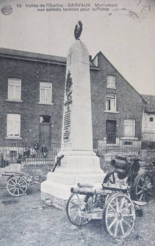 Localisation de ce monument: Dans le parc situé au bord de l'Ourthe, entre le Quai des Outleux et la Grand'Rue. Coordonnées GPS: +50°21'03.10", +5°29'40.56". Inscription figurant sur le monument "MORTS AU CHAMP D'HONNEUR 1914-1918 [Huit noms, classés par ordre alphabétique, sauf un] 1940-1945 [Quatre noms, non classés par ordre alphabétique] MORTS POUR LA PATRIE 1914-1918 [Deux noms, classés par ordre alphabétique] 1940-1945 [Huit noms, non classés par ordre alphabétique] À SES HÉROS LA COMMUNE DE BARVAUX" Voir les noms mentionnés sur ce monument |