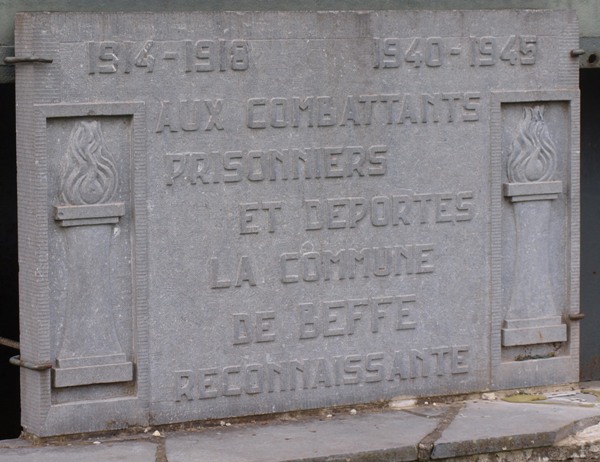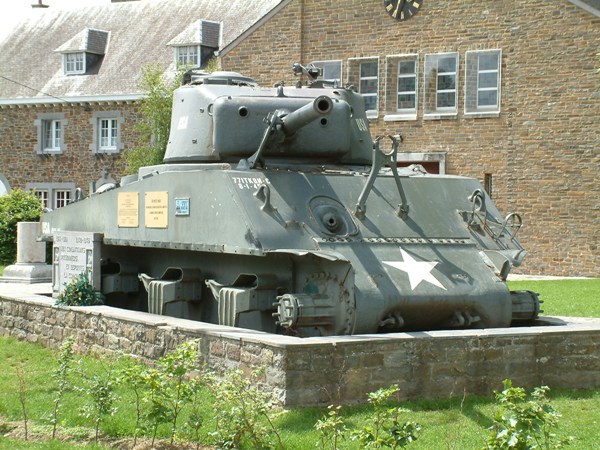 Localisation de ce monument: À la jonction de la rue "Sous le Tonan" et de la rue de l'Église, à proximité immédiate de l'église. Coordonnées GPS: +50°14'41.91", +5°31'23.95". Inscription figurant sur ce monument Plaque en pierre devant le char "1914-1918 1940-1945 AUX COMBATTANTS PRISONNIERS ET DÉPORTÉS LA COMMUNE DE BEFFE RECONNAISSANTE" Plaque de gauche sur le char Sherman "IN DEDICATION TO THE OFFICERS AND MEN OF TASK FORCE HOGAN NOW DESIGNATED - 3RD BN 33RD ARMOR ("PICKLES") 3RD ARMORED DIVISION THE BATTLE OF THE BULGE, 22 DEC 1944, TASK FORCE (TF) HOGAN REPULSED REPEATED ATTACKS BY OVERWHELMING ENEMY FORCES. LOW ON SUPPLIES, THE TF FOUGHT THROUGH ENEMY LINES FROM HERE TO MARCOURAY. ON 25 DEC, OUT OF FUEL, AMMUNITION AND SURROUNDED BY THREE GERMAN DIVISIONS, TF HOGAN DESTROYED ITS EQUIPMENT, INFILTRATED ENEMY LINES AND REJOINED 3RD ARMORED DIVISION TASK FORCE HOGAN HQ 3RD BN, 33RD ARMD REGT. A CO., 33RD ARMD REGT. A CO., 83RD RCN. BN. 1ST PLAT CO. C, 83RD RCN. BN. A BATTERY, 54 FA BN. SECTION OF 486TH AAA BN" Plaque de droite sur le char Sherman "NO MORE WAR AUX AMÉRICAINS, SES COURAGEUX LIBÉRATEURS DE JANVIER 1945 LA COMMUNE DE RENDEUX RECONNAISSANTE JUILLET 1985" Ce monument ne comporte pas de noms. |