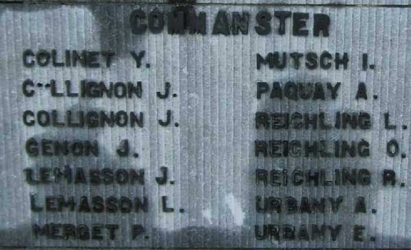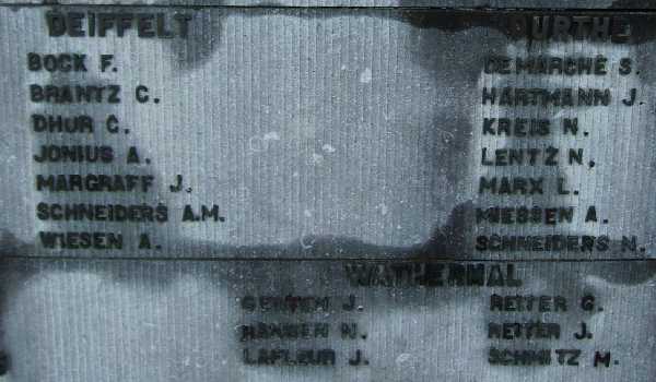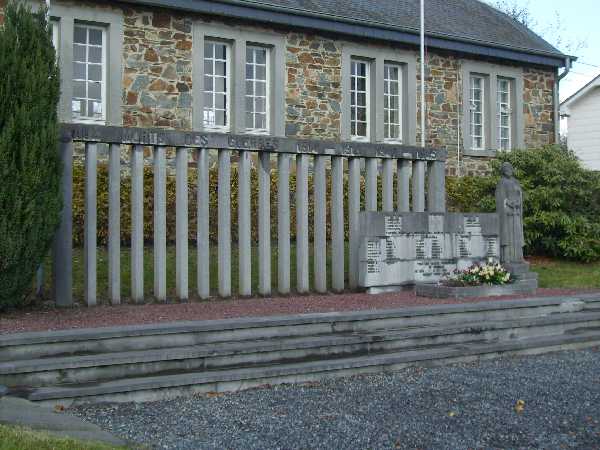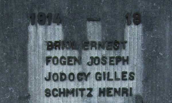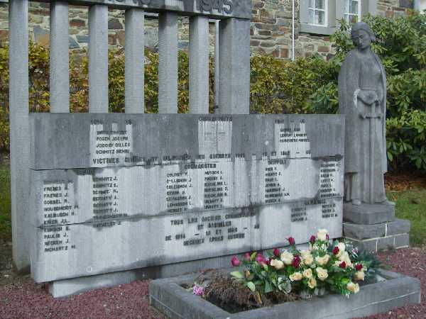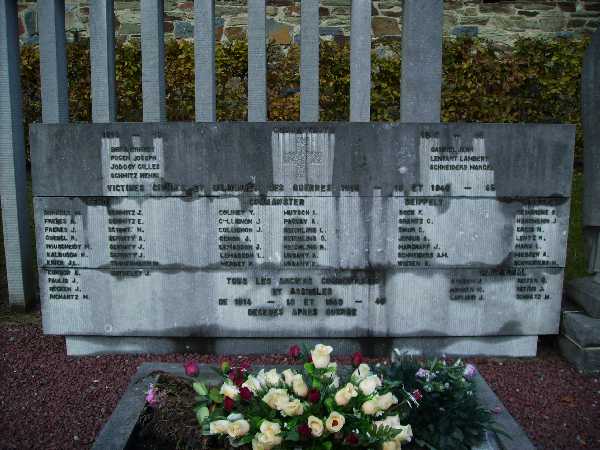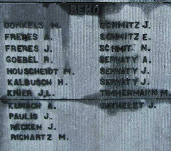Localisation de ce monument: Beho. Inscriptions figurant sur ce monument "AUX MORTS DES GUERRES 1914 – 1918 1940 - 1945 1914 - 18 [Quatre noms classés par ordre alphabétique] COMBATTANTS [Croix] 1940 - 45 [Trois noms classés par ordre alphabétique] VICTIMES CIVILES ET MILITAIRES DES GUERRES 1918 - 18 ET 1940 - 45 BEHO [Dix-neuf noms répartis sur deux colonnes et classés par ordre alphabétique] COMMANSTER [Quatorze noms répartis sur deux colonnes et classés par ordre alphabétique] DEIFFELT [Sept noms classés par ordre alphabétique] OURTHE [Sept noms classés par ordre alphabétique] WATHERMAL [Six noms répartis sur deux colonnes et classés par ordre alphabétique] TOUS LES ANCIENS COMBATTANTS ET ASSIMILÉS DE 1914 - 18 ET 1940 - 45 DÉCÉDÉS APRÈS GUERRE" Voir les noms mentionnés sur ce monument |