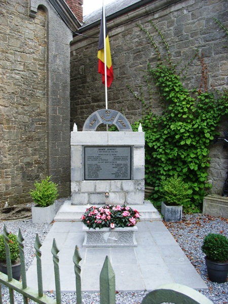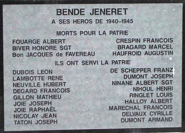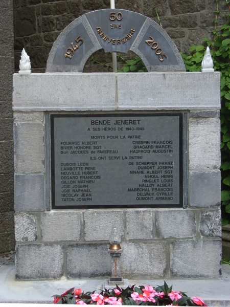 Localisation: Chera Monseu, à droite du porche d'entrée de l'église Saint-Martin. Coordonnées GPS: +50°24'48.80", +5°26'49.00" Inscriptions "1945 - 2005 60EME / ANNIVERSAIRE BENDE JENERET À SES HÉROS DE 1940-1945 MORTS POUR LA PATRIE [Six noms, rangés sur deux colonnes, non classés par ordre alphabétique] ILS ONT SERVI LA PATRIE [Dix-huit noms, rangés sur deux colonnes, non classés par ordre alphabétique]" Voir les noms gravés sur le monument |