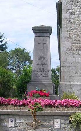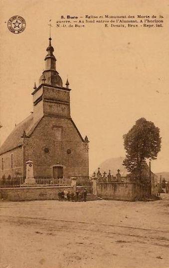Localisation de ce monument: Devant l'église, à l'intersection des rue de Tellin, de Belvaux et de Grupont. Coordonnées GPS: +50°05'19.65", +5°15'34.20". Inscription figurant sur le monument "À / SES / HÉROS LA / COMMUNE / DE / BURE RECONNAISSANTE 1914 - 1918 1940 - 1945 ICI REPOSENT [Cinq noms, classés d'après l'année de décès, avec mention des années de naissance et de décès]" Voir les noms mentionnés sur ce monument |