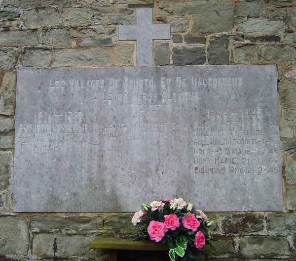 Localisation de ce monument: À l'arrière de l'église de Courtil. Inscription figurant sur le monument "Les villages de Courtil et de Halconreux À leurs héros glorieux 1914 - 1918 [Trois noms] 1940 - 1945 [Huit noms]" Voir les noms mentionnés sur ce monument |