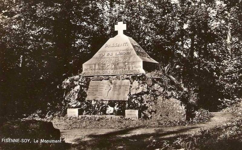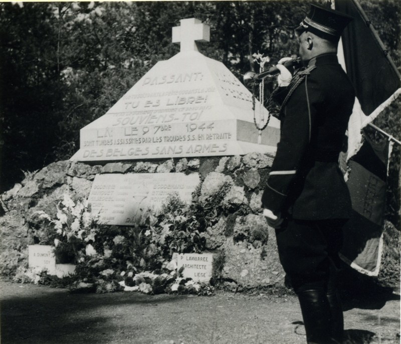 Localisation de ces monuments: Rue Grande. Coordonnées GPS: +50°17'41.88", +5°32'39.67". Inscriptions figurant sur les monuments Monument principal Face avant "PASSANT: QUE TU SOIS DANS LA PEINE OU DANS LA JOIE TU ES LIBRE ! TU AS LE BONHEUR D'ADMIRER CE BEAU PAYS SOUVIENS-TOI LÀ: LE 9 7BRE 1944 SONT TOMBÉS ASSASSINÉS PAR LES TROUPES S.S. EN RETRAITE DES BELGES SANS ARMES MEMBRES DE L'A.S. EN SERVICE COMMANDÉ [Cinq noms, classés par ordre alphabétique] DE LIÈGE" DU M.N.B. EN SERVICE COMMANDÉ [Trois noms, classés par ordre alphabétique] DE SOY R.I.P." Face latérale gauche "MAQUIS D'EREZÉE" Face latérale droite "MAQUIS D'EREZÉE" Monument annexe 1 "A.S. [Blason de l'Armée secrète] [Un nom, avec mention de la date de décès] R.I.P." Monument annexe 2 "A.S. [Blason de l'Armée secrète] [Un nom, avec mention de la date de décès] R.I.P." Réalisation: A. DUMONT, Soy (signé); P. LAWARRÉE, architecte, Liège (signé). Voir les noms gravés sur ces monuments |