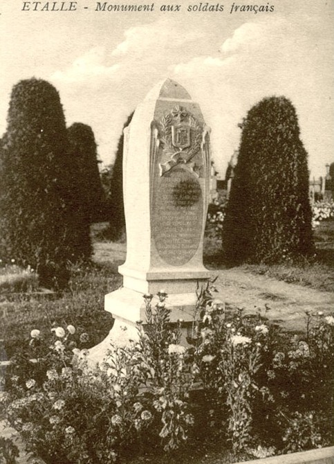 Localisation: Cimetière communal, Rue du Cimetière. Coordonnées GPS: +49°40'35.9", +5°36'10.5" Inscriptions Face avant "RF LIBERTÉ - ÉGALITÉ - FRATERNITÉ LES HABITANTS D'ETALLE ONT ÉRIGÉ CETTE PIERRE À LA MÉMOIRE DES DIX-NEUF SOLDATS FRANÇAIS, TOMBÉS CHEZ EUX, AU MOIS D'AOÛT 1914, POUR LEUR PATRIE ET POUR LEURS ALLIÉS. ICI REPOSENT : [Deux noms, classés par ordre alphabétique, avec mention du grade et du régiment] DEUX SOLDAT FRANÇAIS INCONNUS" Face latérale droite "1940 - 1945 SOLDATS FRANÇAIS TOMBÉS À ETALLE POUR LEUR PATRIE LE 10-5-1940 [Quinze noms, classés par grade] UN INCONNU ST" Plaque au pied du monument "LE 18EME R.C.C. À SES MORTS LE 6/5/78" Voir les noms gravés sur le monument |