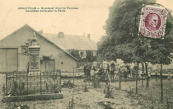 Localisation: À l'intérieur du triangle formé par la route de Meix, la rue Les Douards et la Place du Tilleul. Coordonnées GPS: +49°37'16.73", +5°25'42.00". Inscriptions figurant sur le monument Face avant "AUX SOLDATS DE GÉROUVILLE MORTS POUR LA PATRIE 1914 - 1918" Face latérale droite "[Deux noms]" Face latérale gauche "[Deux noms]" Voir les noms mentionnés sur ce monument |